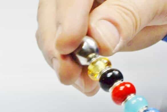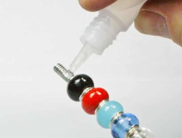 Einen kleinen Tropfen dickflüssigen Sekundenkleber auf den Gewindestift geben und die gewünschte Kugel aufstecken. Durch Drehen der Kugel verteilst du den Kleber gut zwischen Gewindestab und Kugeleinsatz. Bitte nimm aber nicht zu viel Kleber, da er sonst an den Seiten der Kugel hervorquilt und nicht so hübsch aussieht. So arbeitest du dich einfach bis zum Ende des Gewindestabes vor. Achte darauf, die Kugeln schön eng aneinander zu drücken, damit sie gut kleben und sich später nicht drehen.