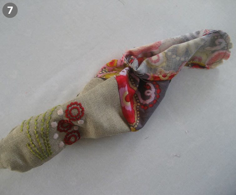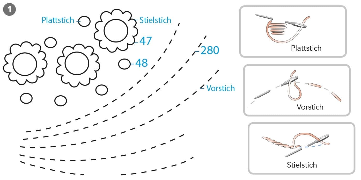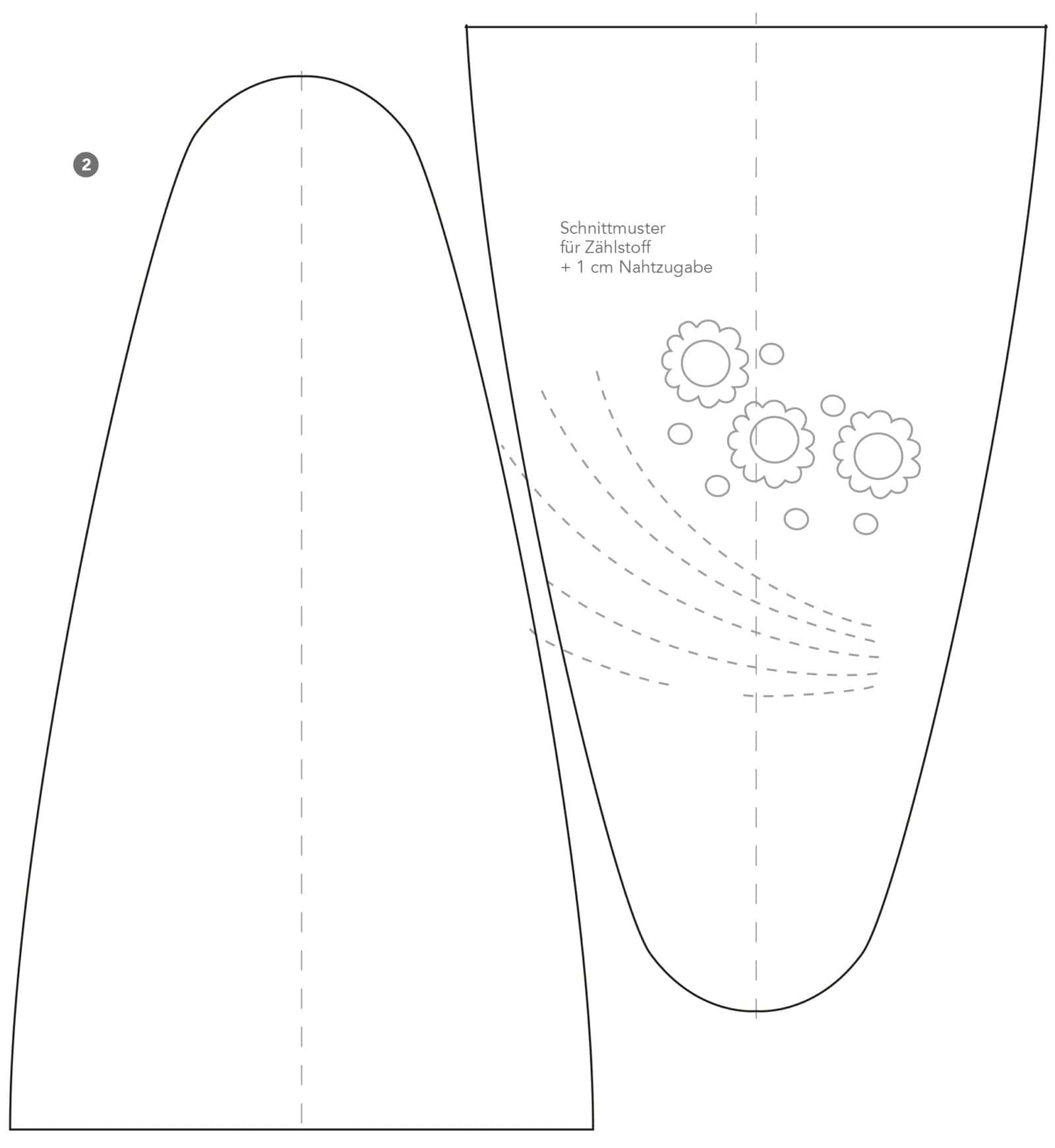 Das Muster mit einem Bügelstift auf das Papier übertragen und mittig auf ein Stück Zählmusterstoff bügeln. Die Stickerei mit ganzfädigem Sticktwist aufsticken.