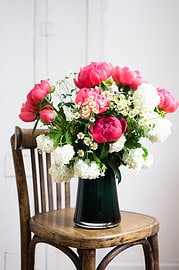 Um eine einzelne Blüte dekorativ zu präsentieren, spießt man Blätter ziehharmonikaartig auf einen dünnen Holzstab auf und legt diesen quer über ein Glasgefäß.