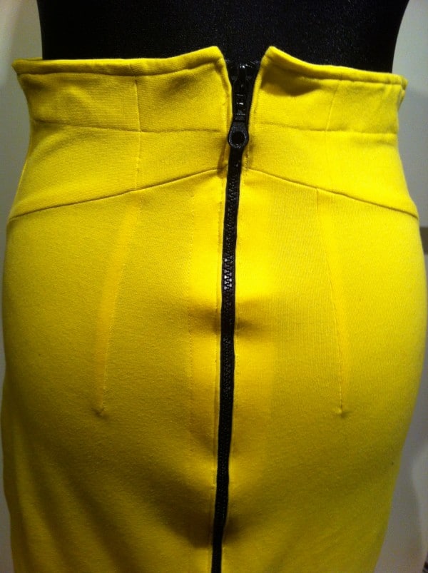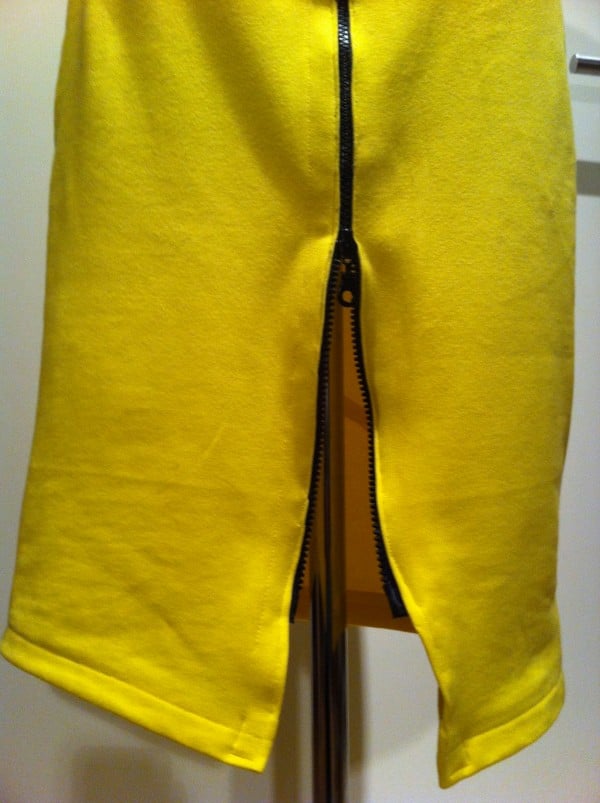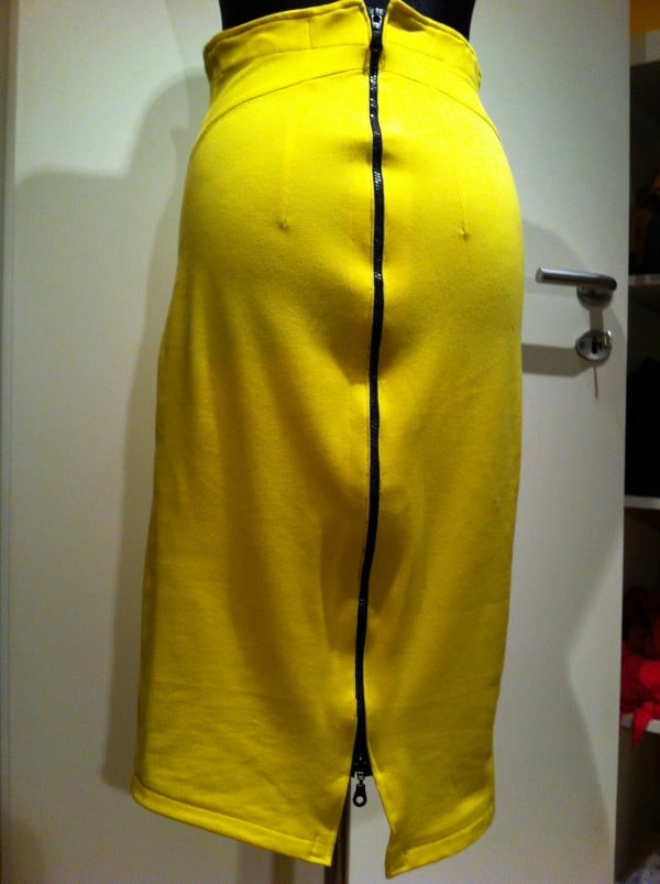 hier mein gelber bleistiftrock aus jersey. vorderseite mit diagonalen nähten, rückseite mit durchgäng. 2-wege-RV in schwarz. der schnitt ist etwas an die 50er angelehnt mit taillenhohen bund.