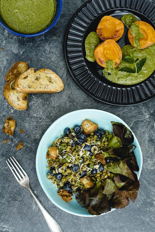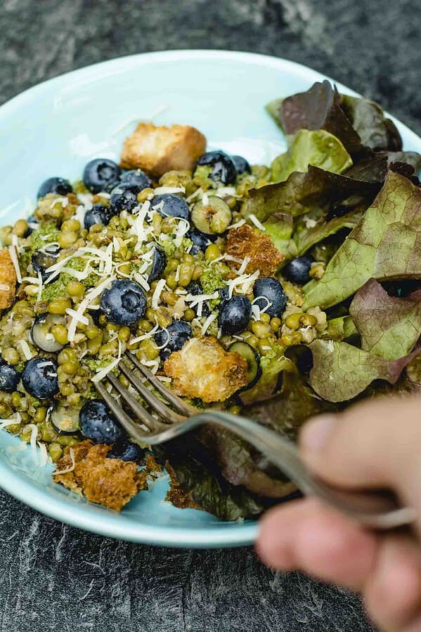 Mungobohnensalat mit Blaubeeren, Käse, Pesto und geröstetem Ciabatta
