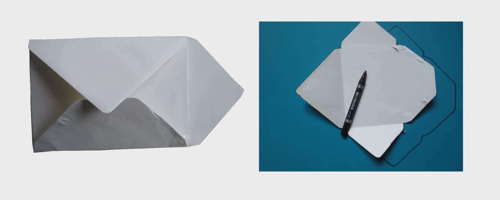 Zuerst nimmst Du vorsichtig einen alten Briefumschlag auseinander um ihn als Schablone auf ein dickes Papier zu übertragen.