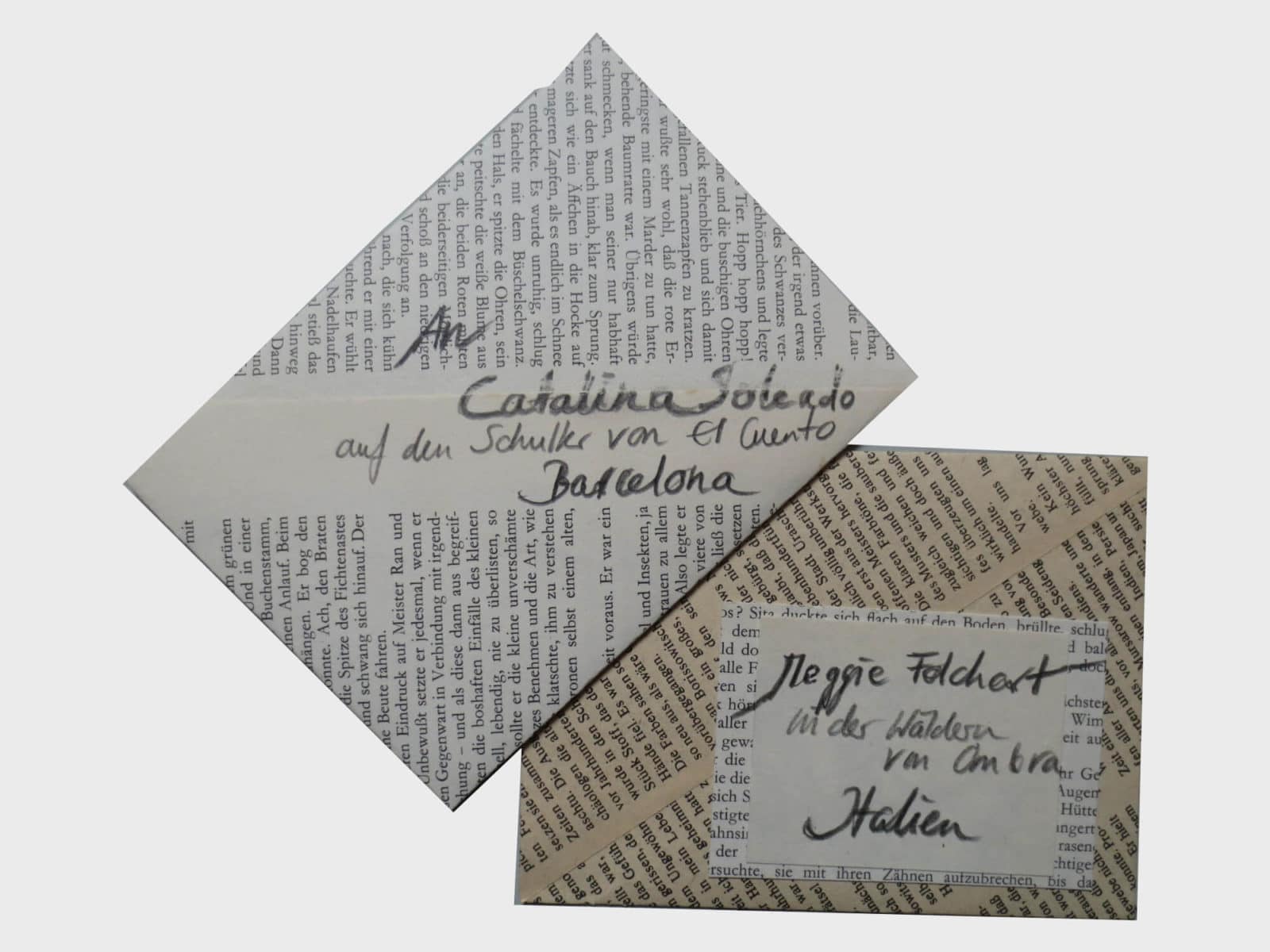 Entweder Deine gewählte Buchseite bietet Platz für die Adresse, oder Du klebst noch ein leeres Stück Buchseite auf. Meine Buchseiten habe ich an zwei Mädchen adressiert, die ich sehr liebe. An Catalina Soleado und Meggie Folchart.Ich hoffe Du kennst die beiden und magst sie auch so sehr.