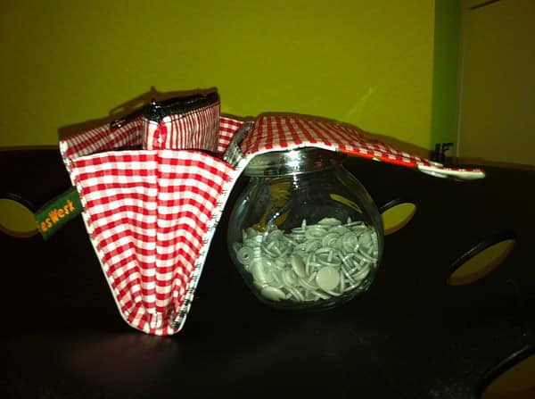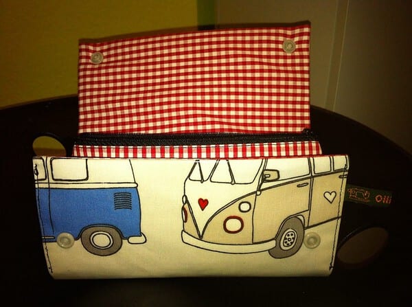 Der Außenstoff besteht aus Wachstuch mit schönen alten Bullys drauf. Innen habe ich zwei verschiedene Karostoffe verwendet.