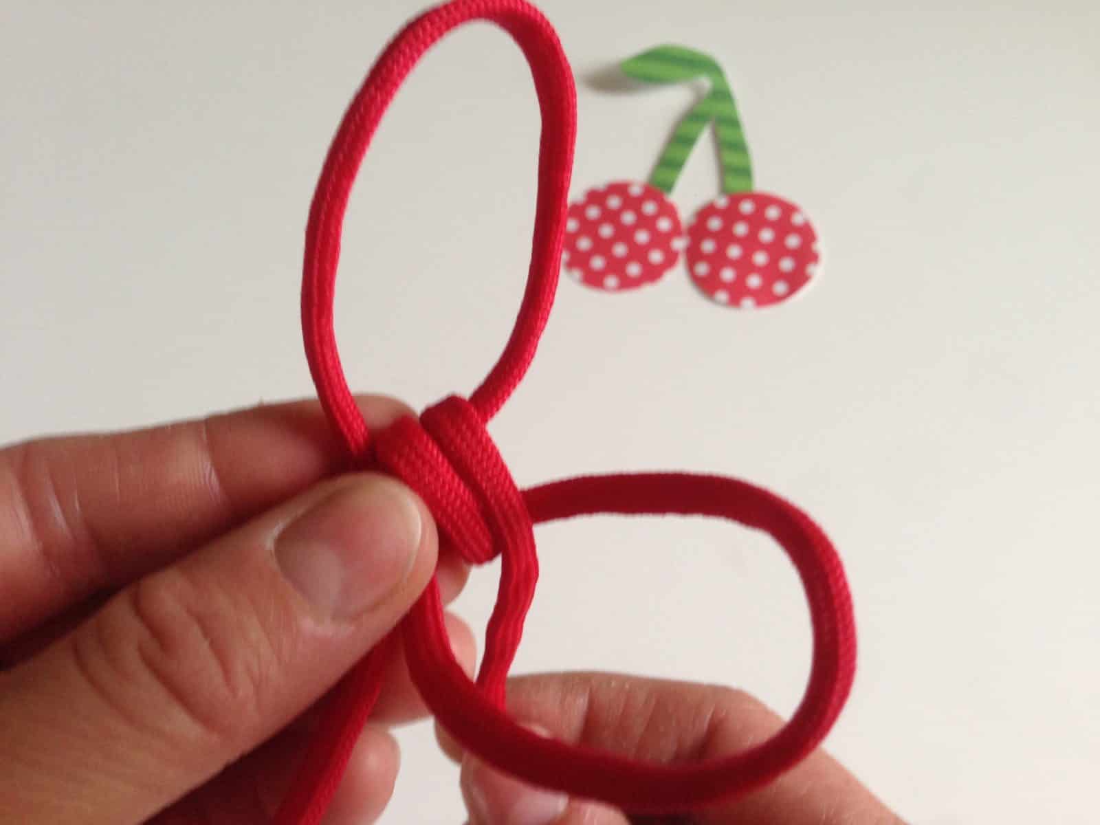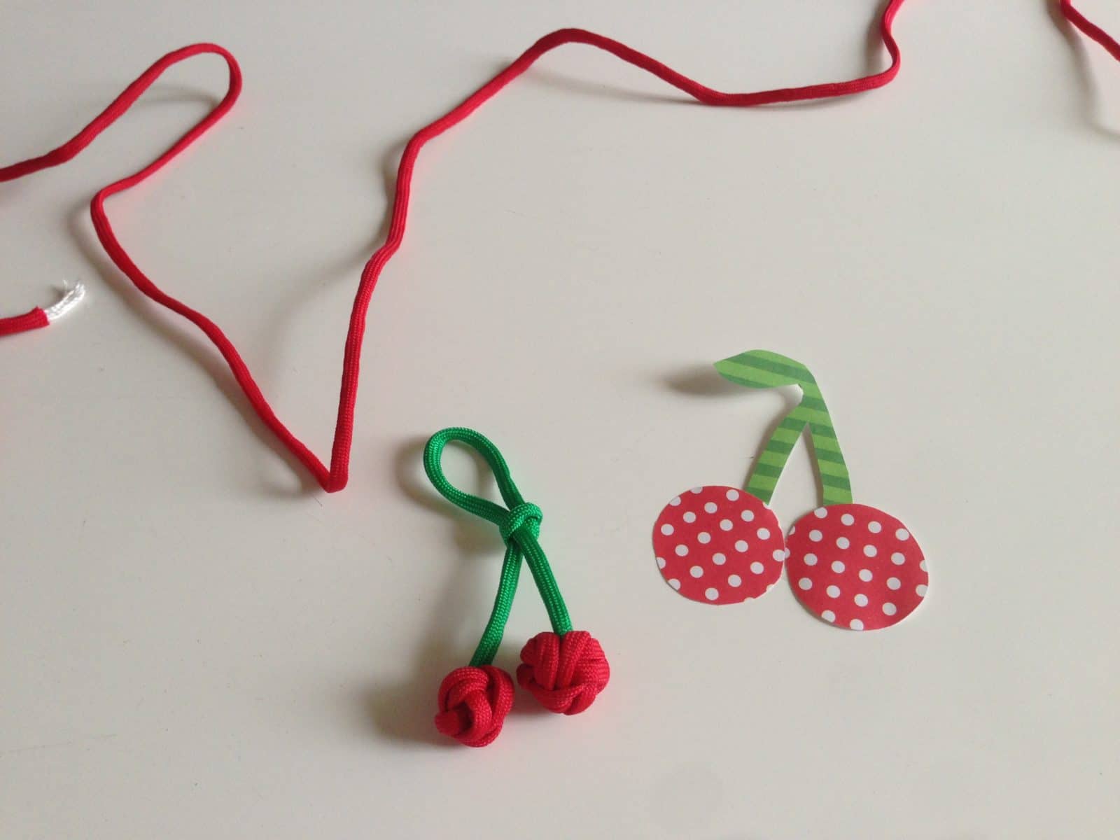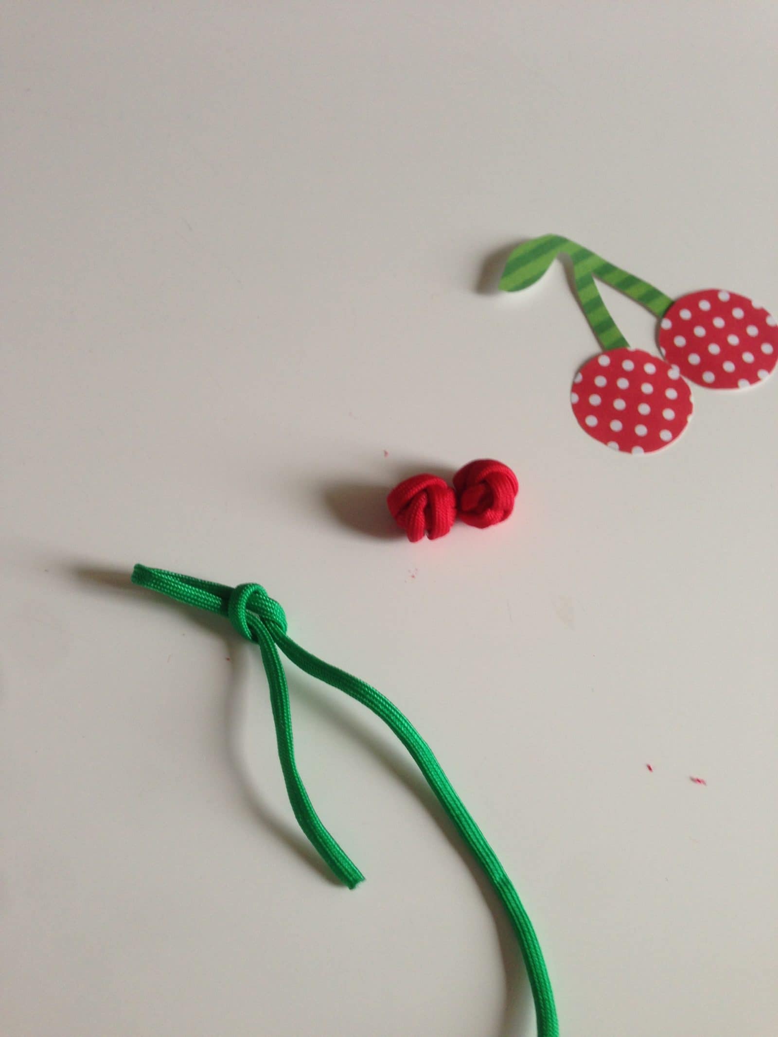- Du brauchst für zwei Kirschen: • Paracord in rot (pro Kirsche ca.30 cm) • Paracord in grün ( ca. 15 cm) • Sekundenkleber • Schere • Zopfgummi