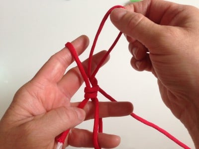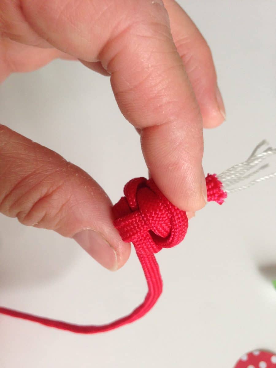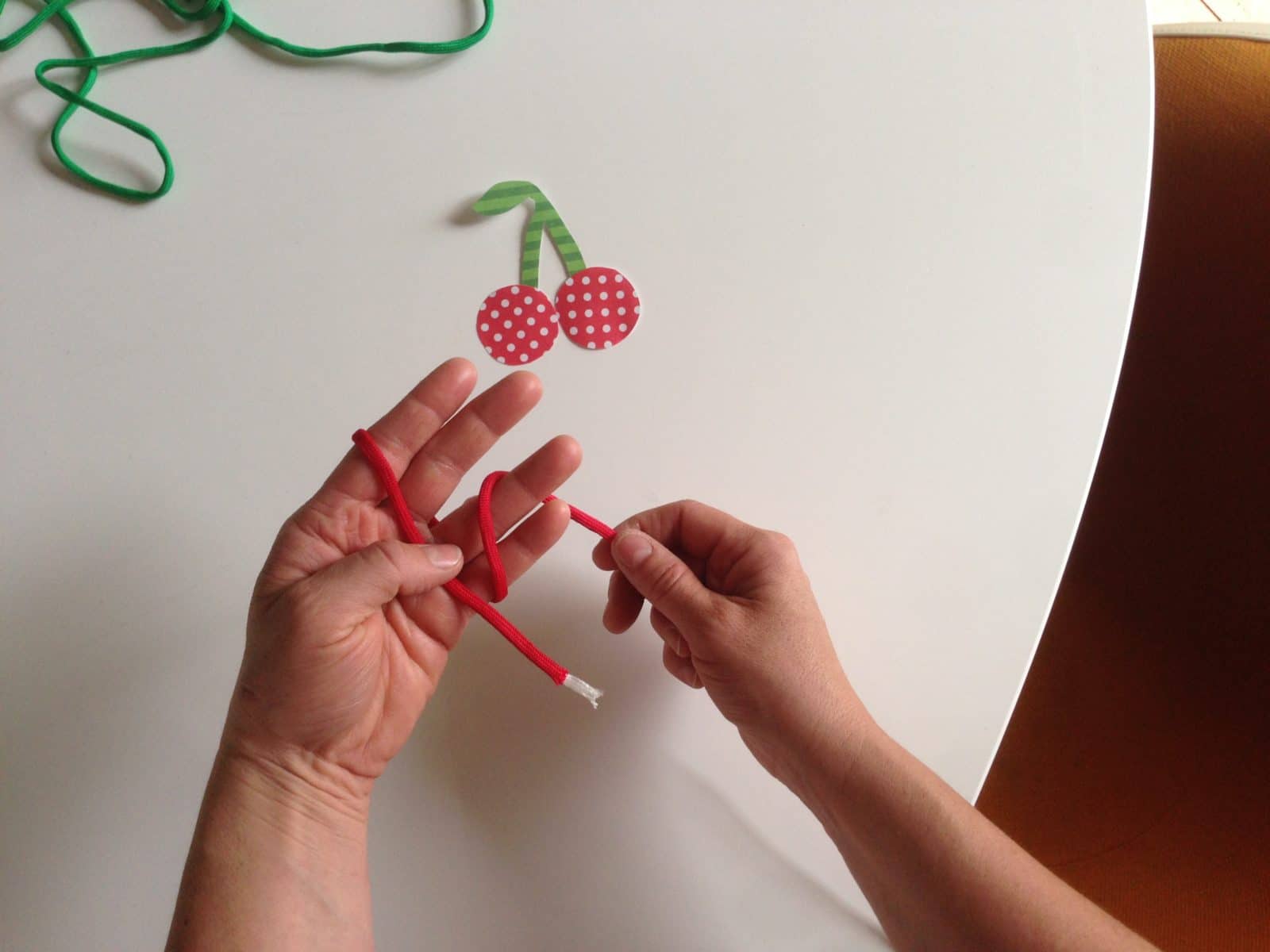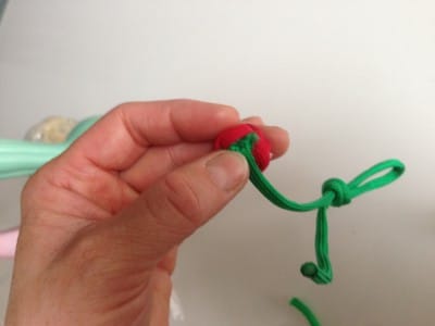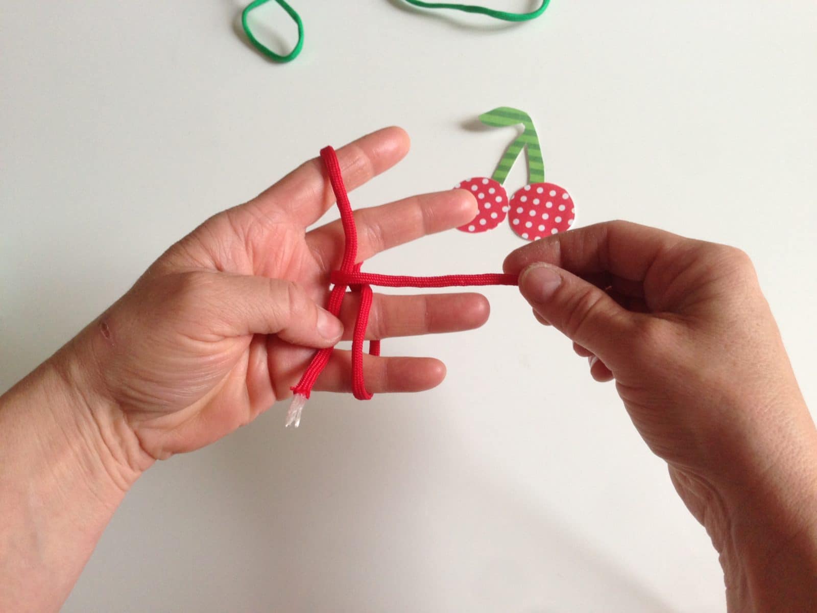 - Du brauchst für zwei Kirschen: • Paracord in rot (pro Kirsche ca.30 cm) • Paracord in grün ( ca. 15 cm) • Sekundenkleber • Schere • Zopfgummi
