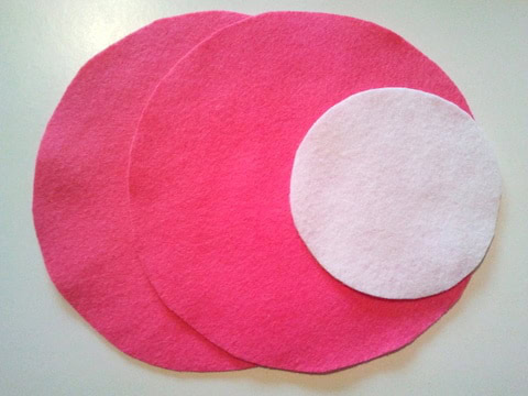 Schneidet euch zunächst drei Kreise aus Filz aus. Meine großen Kreise hatten einen Durchmesser von 14cm, der kleine Kreis von 8cm. Ihr könnt sie aber auch etwas größter machen.
