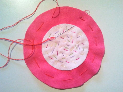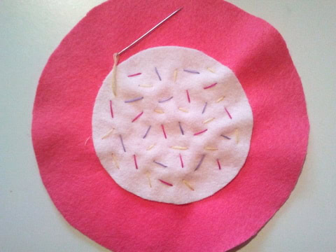 Legt nun den kleineren Kreis auf einen der größeren Kreise und näht ihn mit vielen bunten Stichen fest.