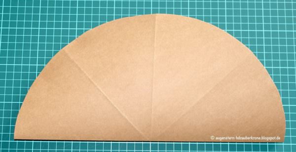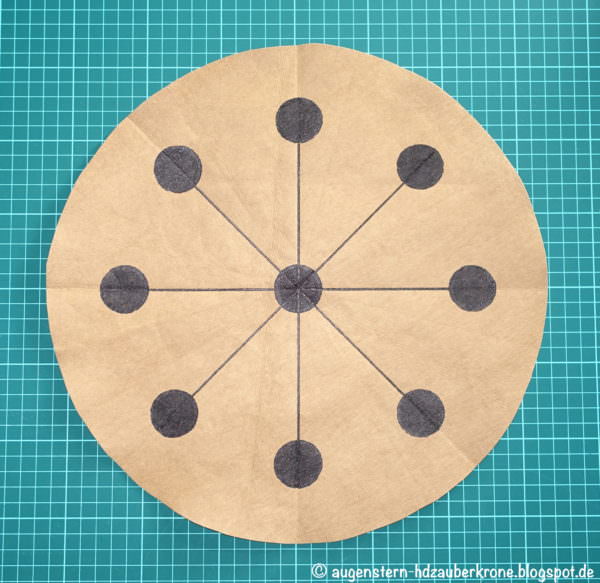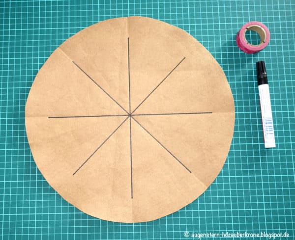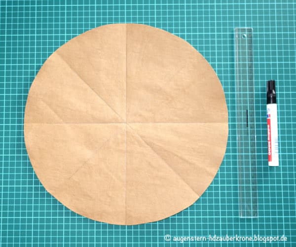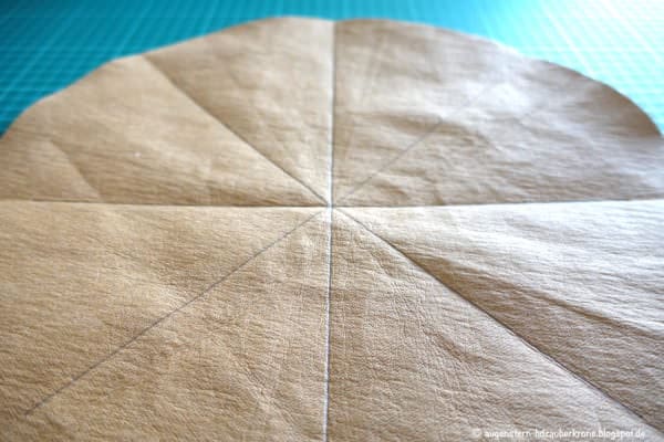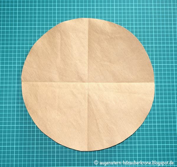 Dann den Kreis achteln, sprich so falten, dass 8 Teile (Faltknicke) zu sehen sind. Dafür die Knicke genau übereinander legen.