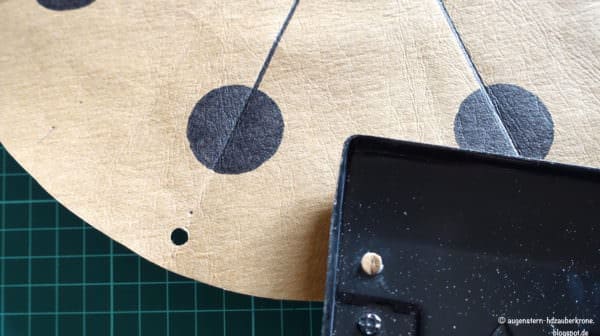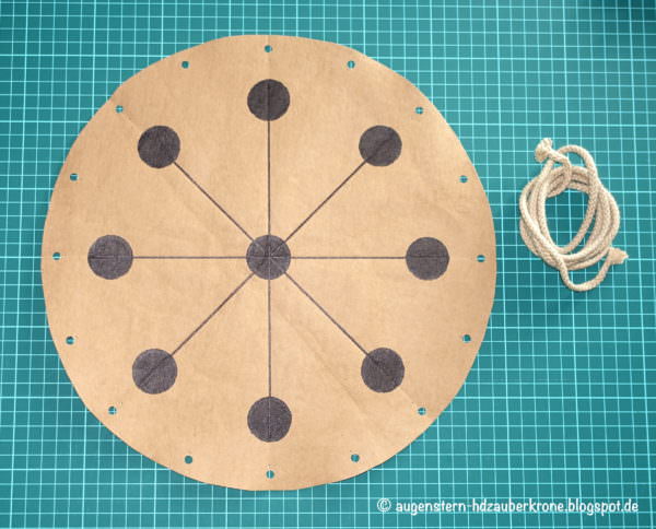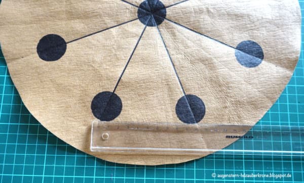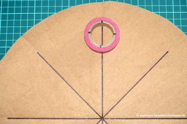 Mit dem Lineal die Mitte bestimmen und zwischen den Punkten die Mitte eingezeichnet, für die Kordellöcher. Diese Löcher werden mit einem handelsüblichen Bürolocher ausgestanzt.