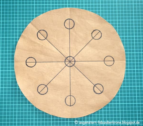 Diese Linien (Knicke) werden nun mit einem Bleistift nachgezogen. Jede Linie sollte nur 13 cm lang sein. Also mit dem Bleistift vom Mittelpunkt 6,5cm zum Rand entlang ziehen.