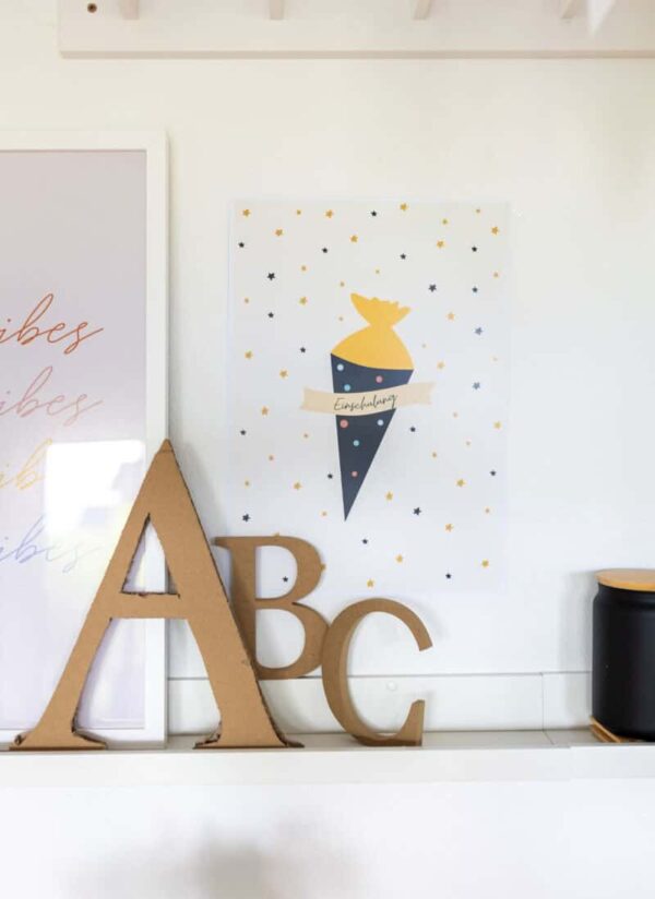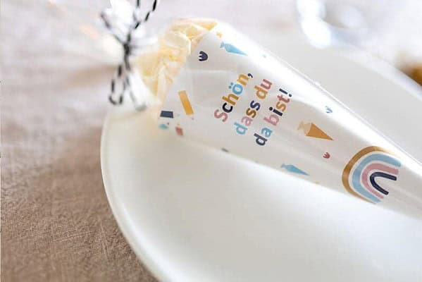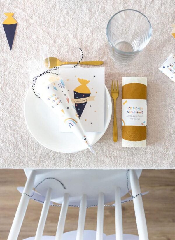 Da ich die Tage vor der Einschulung möglichst entspannt und mit viel Zeit für Little M verbringen wollte, habe ich die komplette Deko schon rechtzeitig davor vorbereitet. Die Zeit war eh aufregend und ereignisreich genug, da wollte ich die Abende nicht noch mit der Suche und Bastelei nach Deko für den festlichen Rahmen verbringen. 😉 Entstanden sind simple Ideen, die nur ausgedruckt und ausgeschnitten werden müssen. Dazu ein paar einfache und schnelle DIY-Ideen für kleine Gastgeschenke oder die Tischdeko.