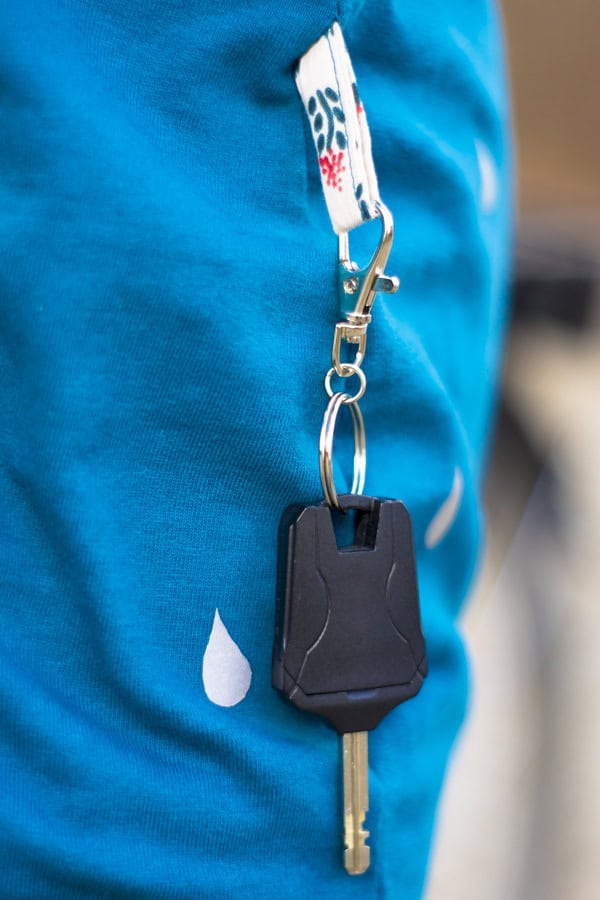 - Der Fahrradschlüssel kann direkt am Pullover eingehängt werden.
