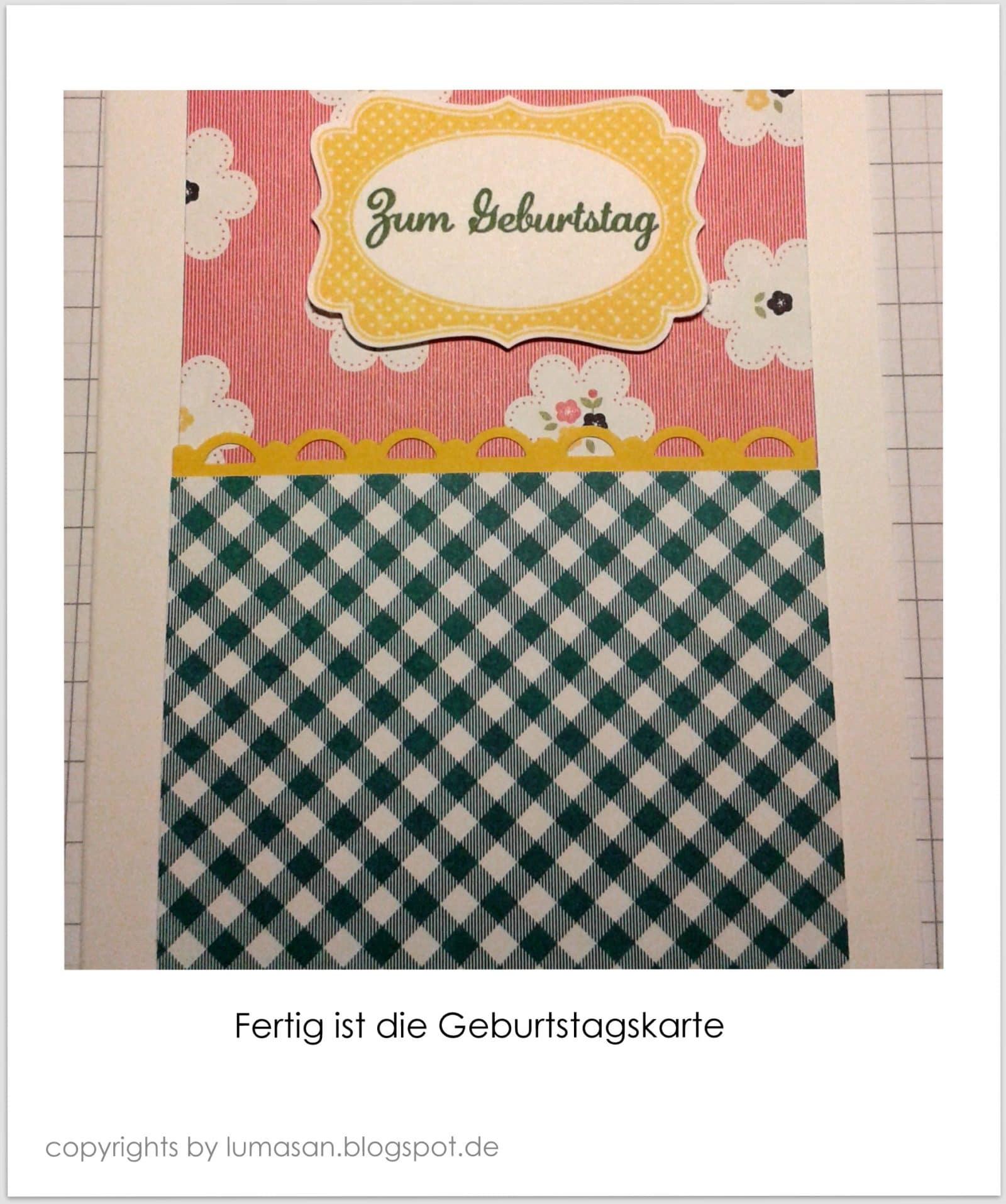 Ihr nehmt nun das karierte Designpapier und klebt dieses auf den gelben Farbkarton (s. Bild).
