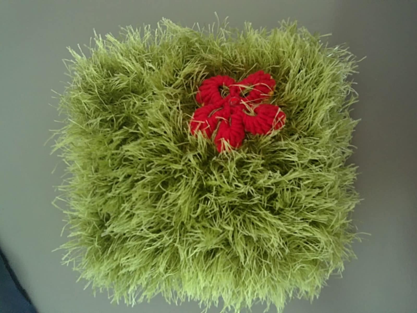 Ist die Höhe erreicht, einfach an zwei seiten mit einem langen Faden der Wolle vernähen. Einfacher Schlingstich reicht aus. Ist das Täschchen fertig, mit einer einfachen Haarbürste über die Naht und alle Fusseln sind wieder da und die Naht ist weg! Jetzt nenn ichs' die grüne Putzwiese :-)
