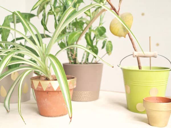 Auf den nächsten Topf habe ich im unteren Bereich mit dem Lackstift ein Muster gemalt und den kleinen Topf habe ich mit goldenem Lack bestrichen.