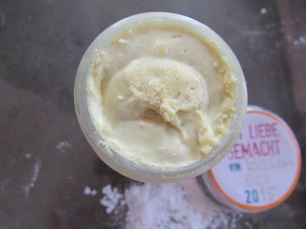 Nun kommt der Handmixer zum Einsatz. Mit ihm schlägt man die Masse kräftig auf, das dauert ca. 3 Minuten. Danach kann man die Creme auch schon in Gläschen füllen und verwenden.