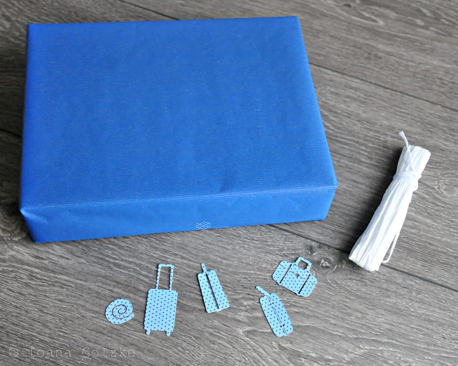 Diese Gepäckstücke verseht ihr mit kleinen Löcher (ich habe diese Lochzange benutzt), durch ihr dann vorsichtig ein Band zieht, (es soll lang genug sein, damit es 2-4 Mal um das Geschenk umwickelt werden kann). Wickelt dann das Band mit dem Gepäck um das Geschenk und verknotet es auf der Geschenkunterseite. Das Gepäck kann dann vorsichtig auch hin und her bewegt werden, wie auf einem Gepäckband am Flughafen :-)