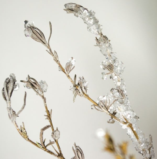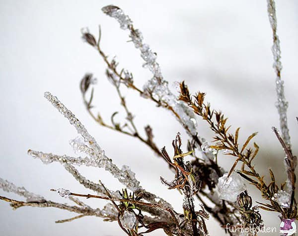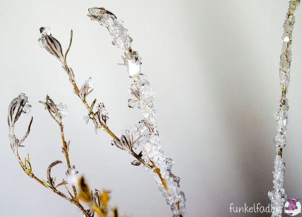 Diese glitzernden Äste erinnern mich immer an eine verzauberte Winterlandschaft mit wunderschönen Eiskristallen. Es handelt sich dabei um getrockneten Lavendel, den ich mit selbstgezüchteten Kristallen habe bewachsen lassen. Das klinkt kompliziert, ist aber im Grunde super einfach.