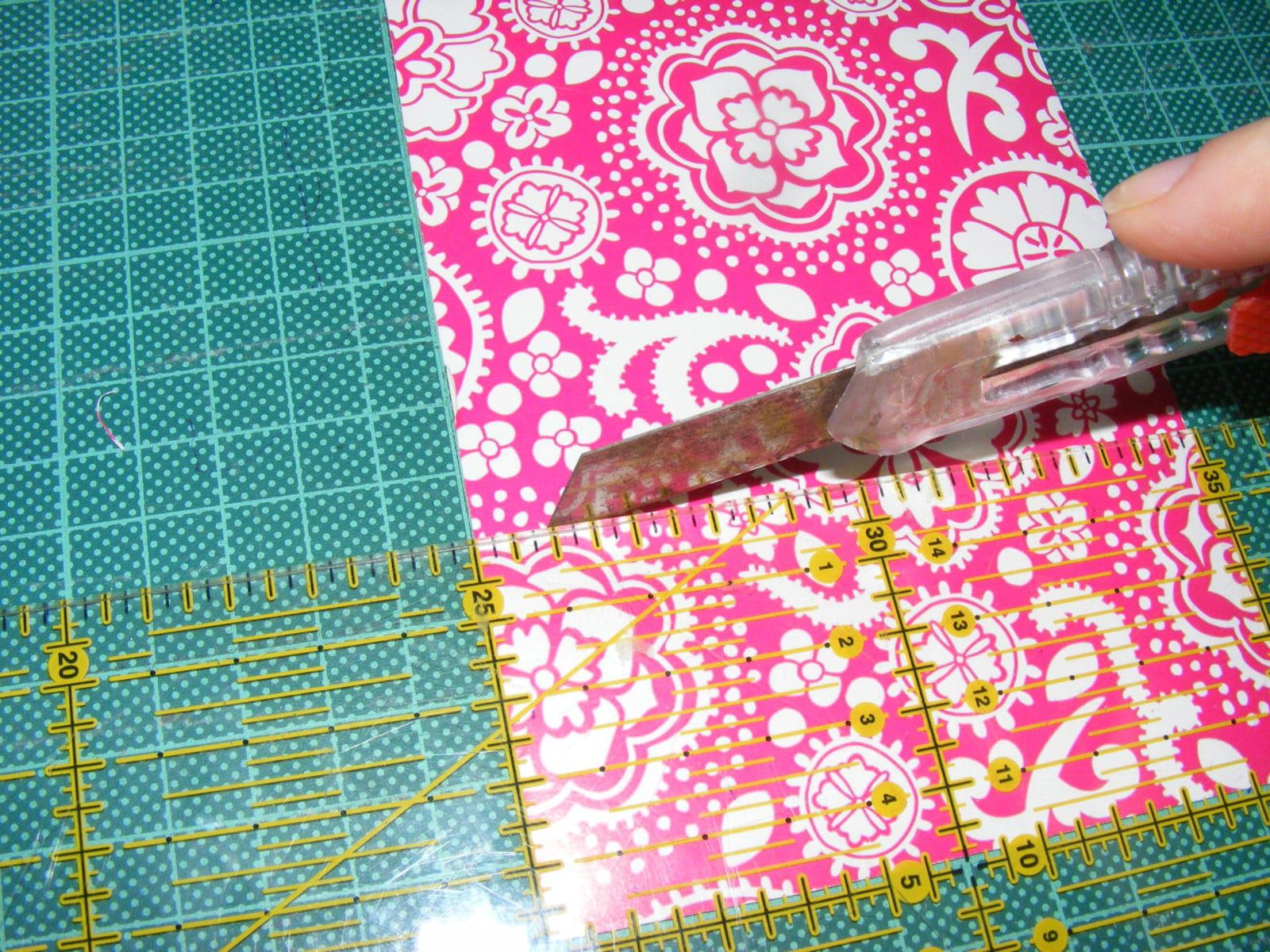Wenn ihr Fotopapier in Postkartengröße habt, kann man 6 Teile à 5x5 cm schneiden. Ich habe 10 Papiere verbraucht (jeweils 2 aufeinander!) , habe also 30 Teile bzw. 15 Paare. Am einfachsten geht es mit so einem Patchwork Lineal und Schneidematte, aber das Fotopapier läßt sich auch gut mit der Schere verarbeiten.