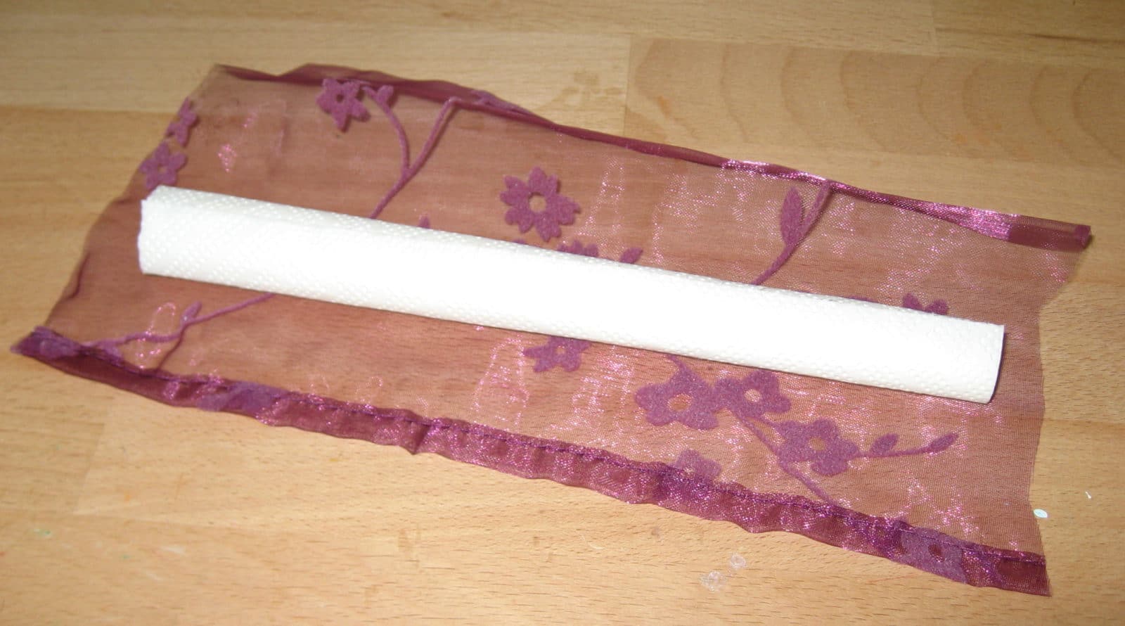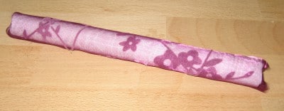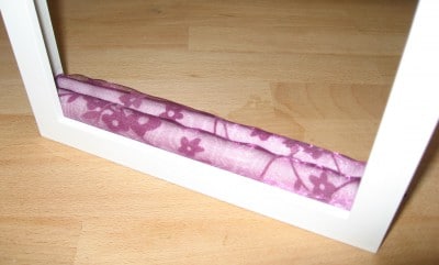 Küchenrolle auf Länge des Rahmens (Unterseite) zurechtschneiden und in Stoff einwickeln (mit Heißkleber festmachen) Bei dünnem Stoff zweimal umwickeln. Von dieser Rolle benötigt ihr 2 Stück.