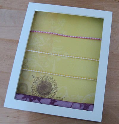 Bilderrahmen mit tiefem Boden (3,5 cm; z.B. von Ikea) nehmen und Rückseite sowie das Papier und Glas entfernen.