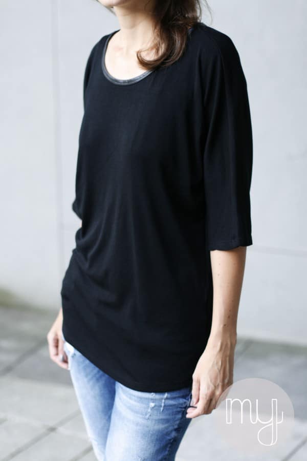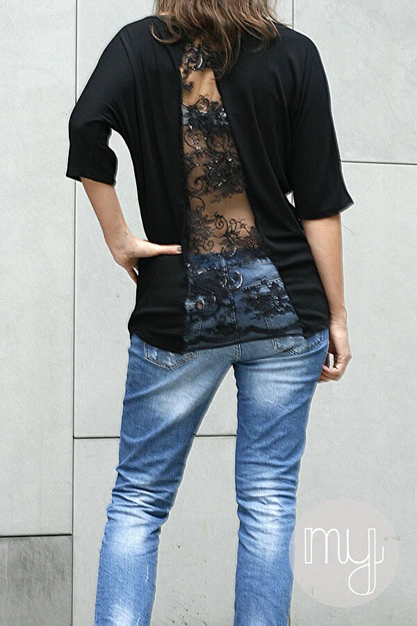 In letzter Zeit habe ich oft Shirts mit Spitzeneinsatz bei Pinterest gesehen und mich daran erinnert, dass bei mir auch noch ein schwarzer Spitzenstoff herumliegt. Dieses DIY ist übrigens sehr einfach zu nähen. Ihr braucht nur ein locker sitzendes Shirt und ein Stück Spitzenstoff.