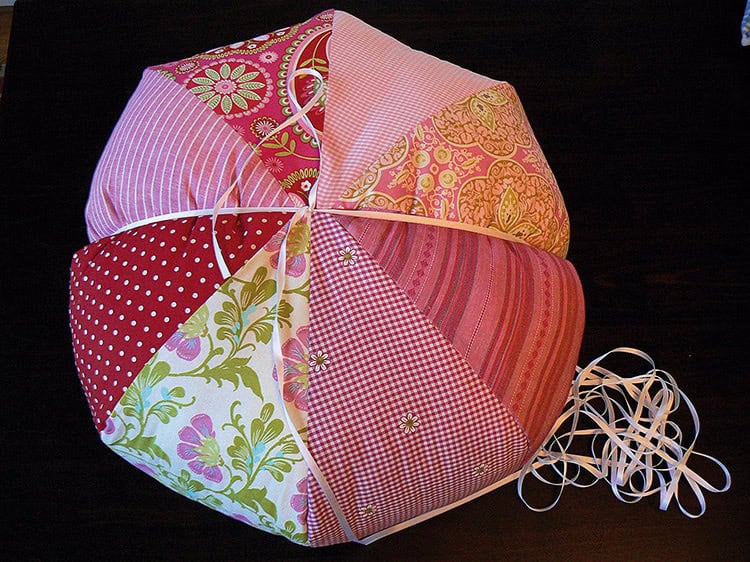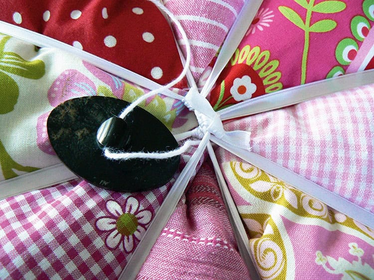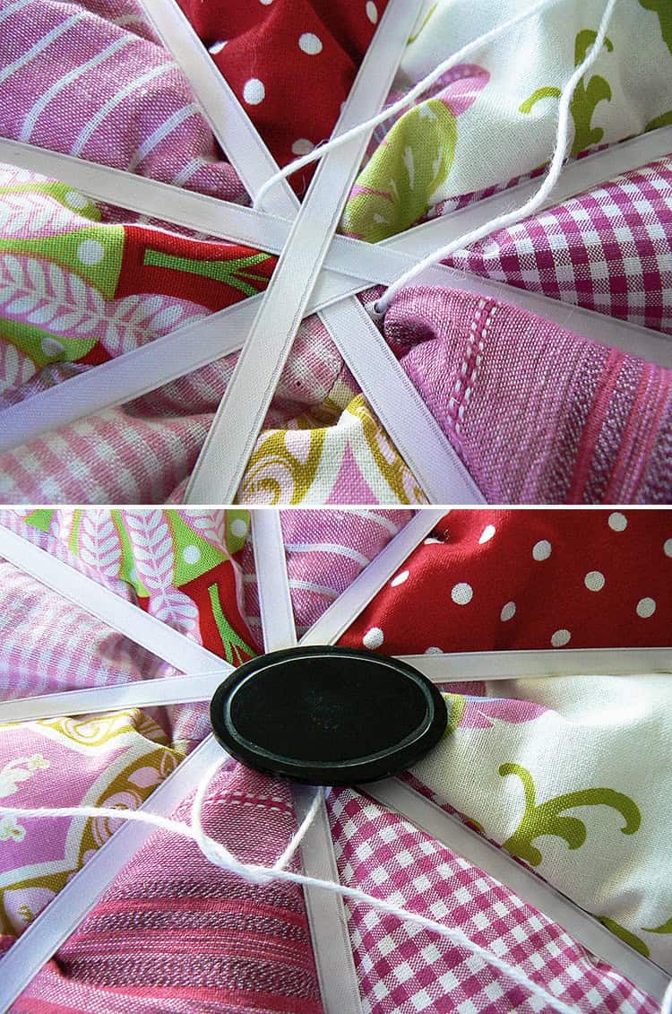 Das Satinband nach und nach um alle Nähte wickeln und auf der oberen Seite verknoten. Damit die Bänder tatsächlich weitestgehend auf den Nähten liegen, ist es an einigen Stellen notwendig, mehrere Knoten an verschiedenen Stellen zu machen. Auf der unteren Seite die Bänder eventuell mit ein paar Heftstichen fixieren. Darauf achten, dass Knoten und Stiche nachher alle problemlos unter dem Knopf verschwinden!
