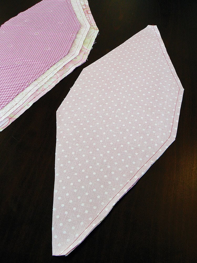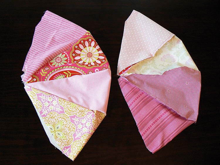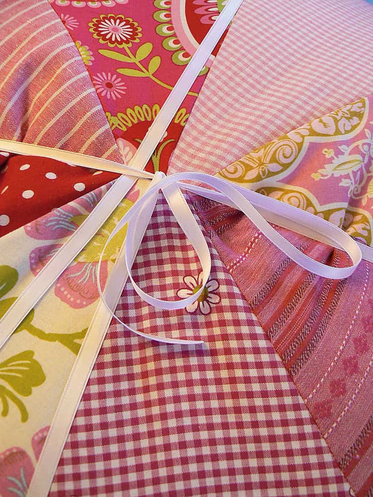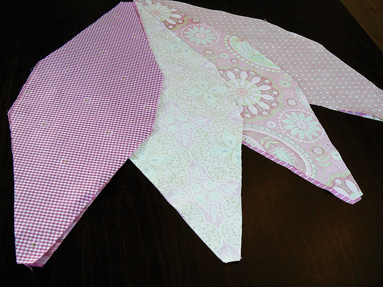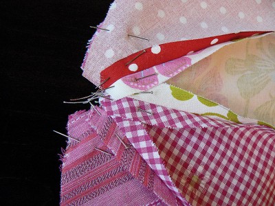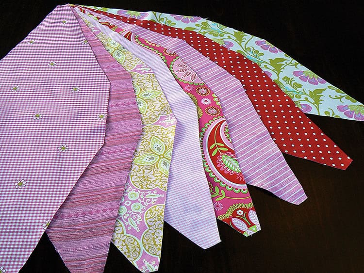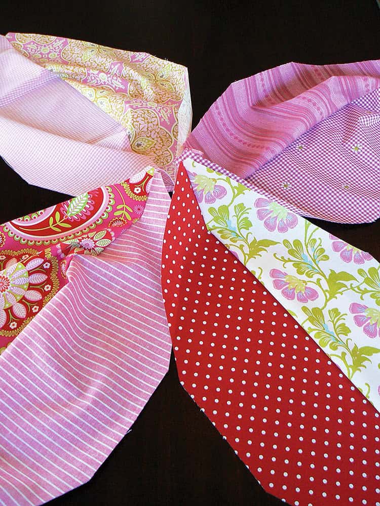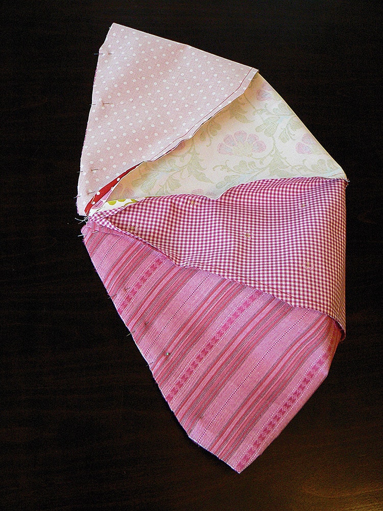 Schnittmuster anfertigen und auf den Stoff legen. Eventuell die Umrisse mit einem weichen Bleistift übertragen und die Stoffe ausschneiden. Die Stoffzuschnitte in der gewünschten Farb- bzw. Musterfolge zurechtlegen.