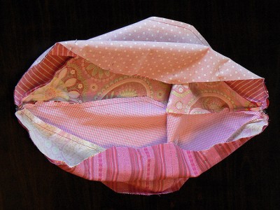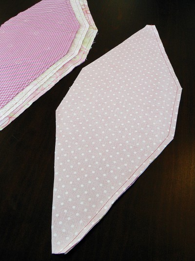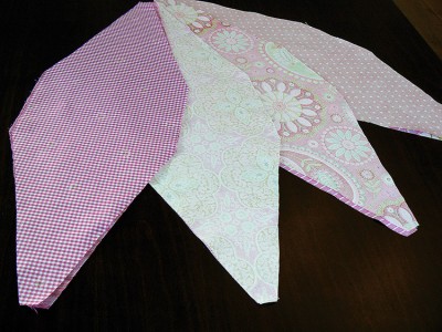 Die vier so hergestellten Teile noch einmal in der richtigen Reihenfolge aneinanderlegen, damit nichts durcheinandergerät. Wieder zwei nebeneinanderliegende Teile rechts auf rechts aufeinanderlegen und an einer Längsseite zusammensteppen. Darauf achten, dass es sich bei den zusammengenähten Längsseiten auch um die Stoffe handelt, die später nebeneinander liegen sollen!