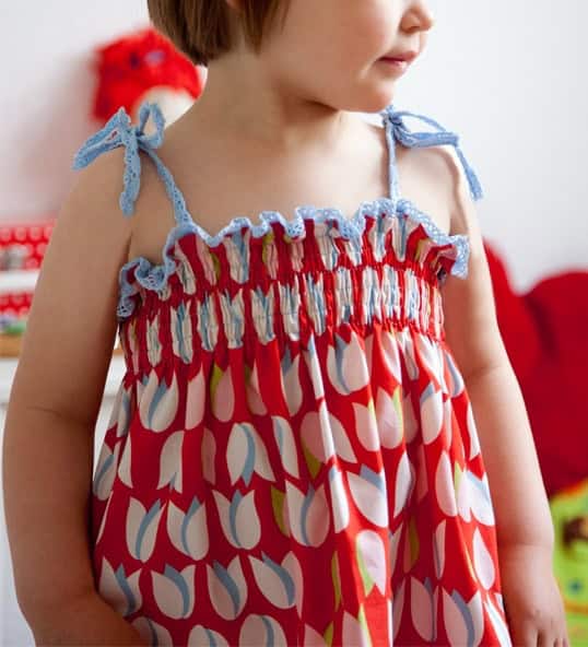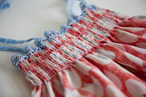 Das „Easy-Peasy“ Sommerkleid für kleine, aber auch für große Mädchen ist schnell genäht. Bei einem rechteckigen Stück Stoff werden an der Längsseite mehrere Smoknähte im gleichen Abstand mit der Nähmaschine genäht. Dabei wird der Gummifaden einfach auf die Unterfadenspule mit der Hand aufgewickelt. Als Träger und Verzierung kann man beispielsweise Web- bzw. Schrägbänder, Spitzenborten oder Zackenlitzen verwenden.