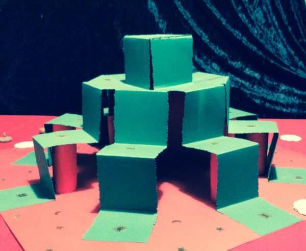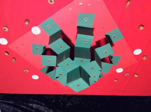 24 Origamischachteln (aus Flyern aus aller Welt) auf einer grünen Treppchenpyramide. Der Kalender sorgt schon beim Suchen nach der richtigen Box für Freude und kann immer wieder verwendet werden
