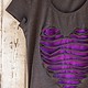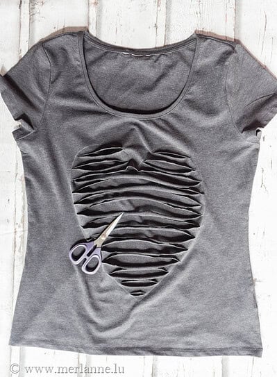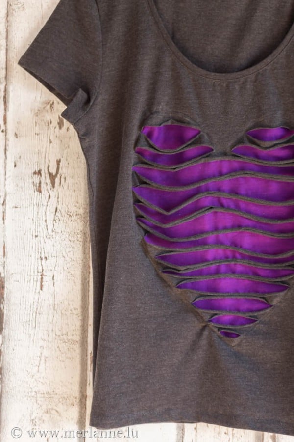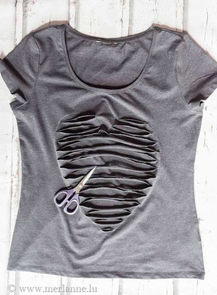 Zuerst malt Ihr aufs T-Shirt mit Schneiderkreide ein Herz und Linien, die ca. 2 cm auseinanderliegen (ich hatte mir aus festem Karton eine Herz-Schablone gemacht). Nun schneidet Ihr die Linien ganz vorsichtig durch (aufpassen, dass Ihr nicht ins Rückenteil des T-Shirts schneidet).