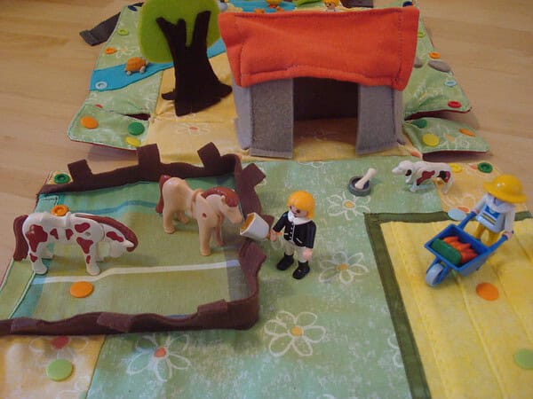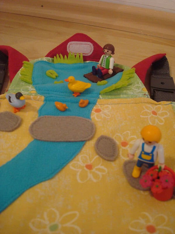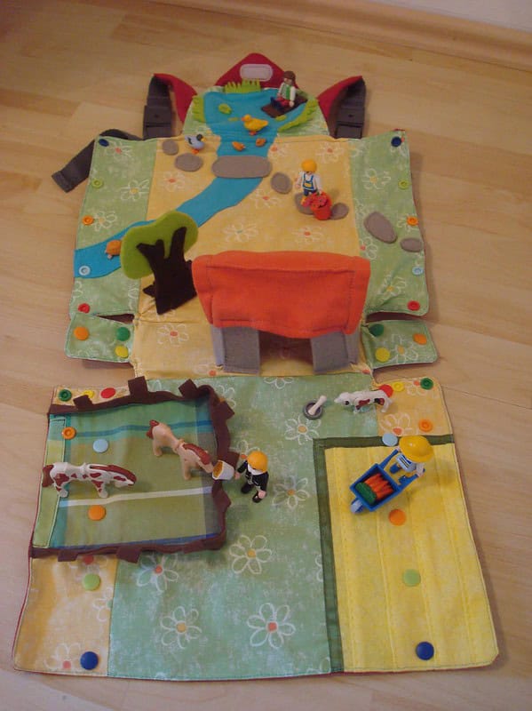 Zuerst habe ich das Schnittmuster auf 50% verkleinert. Damit der Rucksack aber auch mit Hilfe von Kam Snaps komplett zur Spiellandschaft geöffnet werden kann, musste ich dann leider doch ein bisschen an der Vorlage abändern. Um es dem kleinen Mann leichter zu machen, sind alle Taschen entweder mit Klettverschluss oder Druckknöpfen versehen, denn Schnallen kann er leider noch nicht öffnen. Zudem ist über die gesamte Vorderseite hinweg noch eine flache Tasche angebracht und die Seitentaschen sind weiter gefasst, damit auch Spielfiguren, Taschentücher oder ein Snack darin Platz finden. Und aufgeklappt hat das Zwergenkind immer eine Spielwiese dabei :)