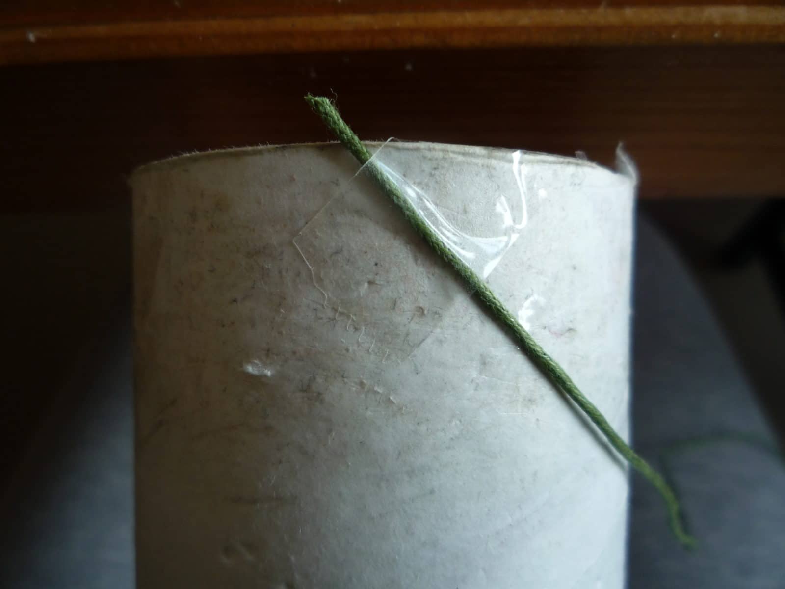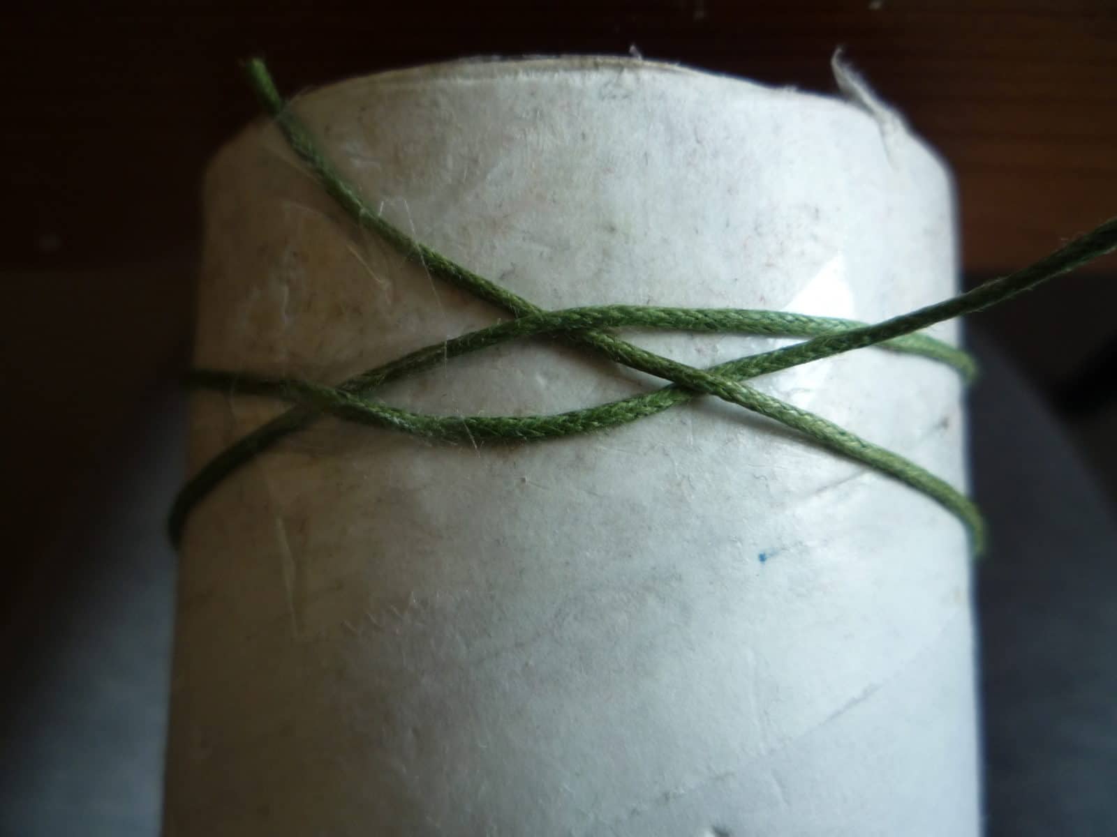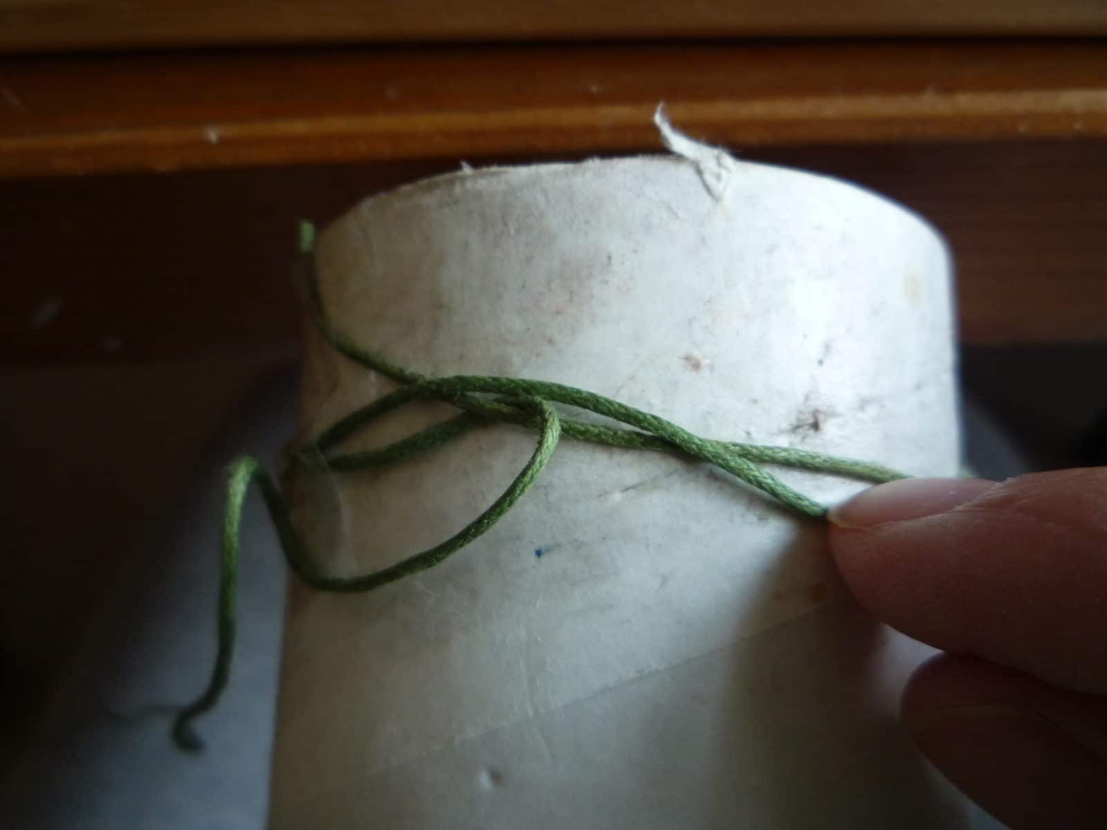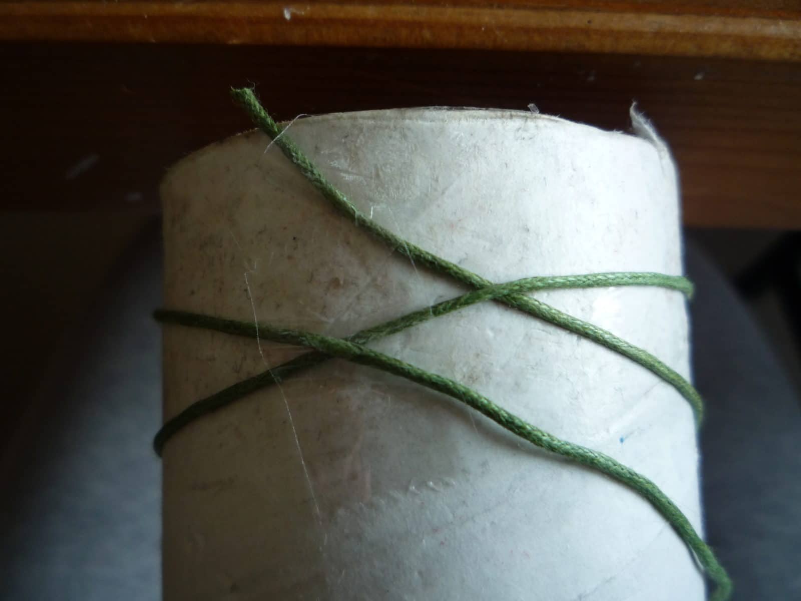 Das eine Ende der Kordel wird am Rand der Pappröhre festgeklebt mit Tesa, danach wird das andere Ende einmal um die Röhre geführt, so dass sich die beiden Kordeln zum Schluss wieder überschneiden.