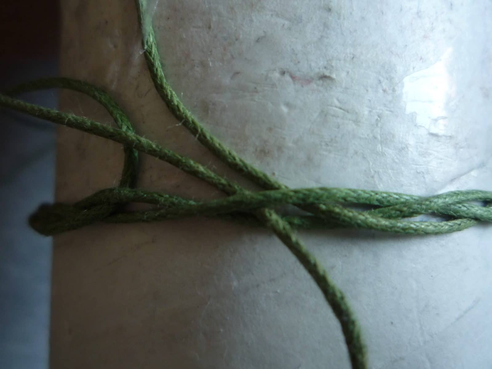 Dann die Kordeln die auf der Röhre liegen überkreuzen damit eine Öffnung entsteht, die lose Kordel durchführen. erst unter, dann über, so weiter machen bis man wieder am Anfang angekommen ist. (Die Pappröhre immer mit drehen)