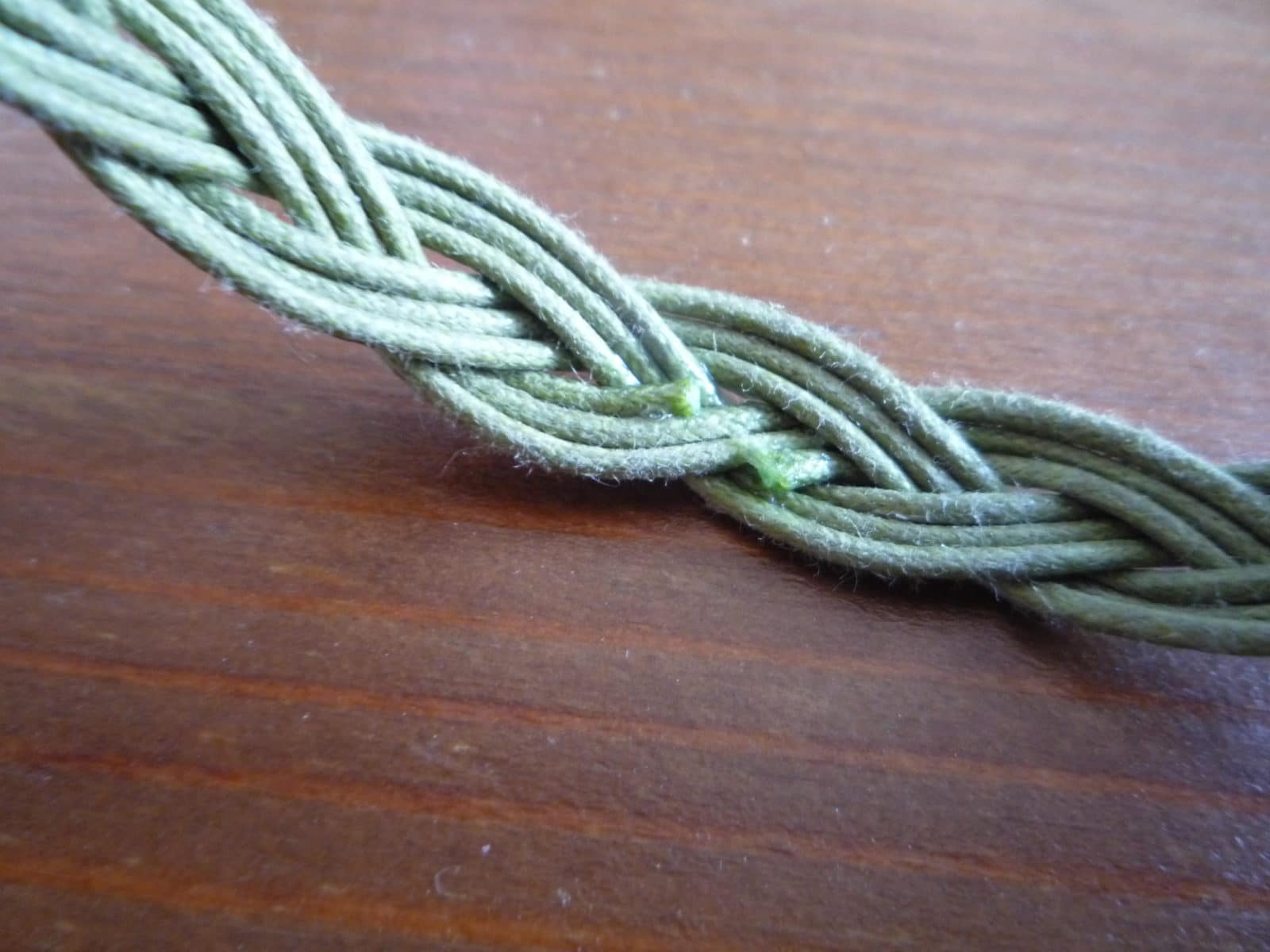 Wenn man wieder am Anfang angekommen ist, sollte die bewegliche Kordel so liegen, dass man bei der ersten festgeklebten Kordel wieder einfädeln kann. So folgt man dem selben Pfade wieder um die Flechte zu verdoppeln und zu verdreifachen.