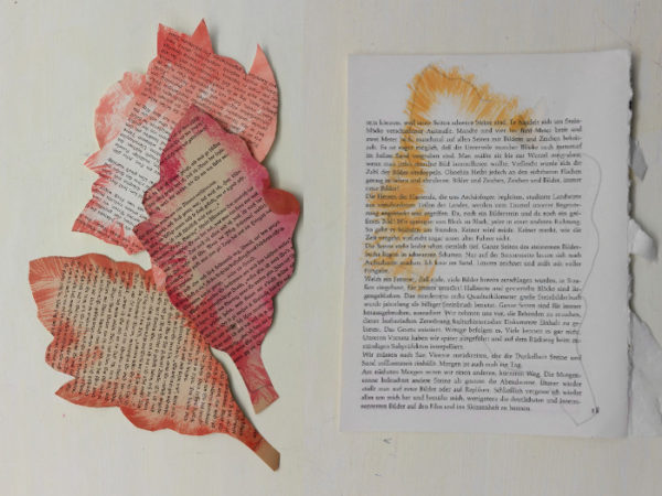3Herbstblätter aus unterschiedlich gefärbten Buchseiten: