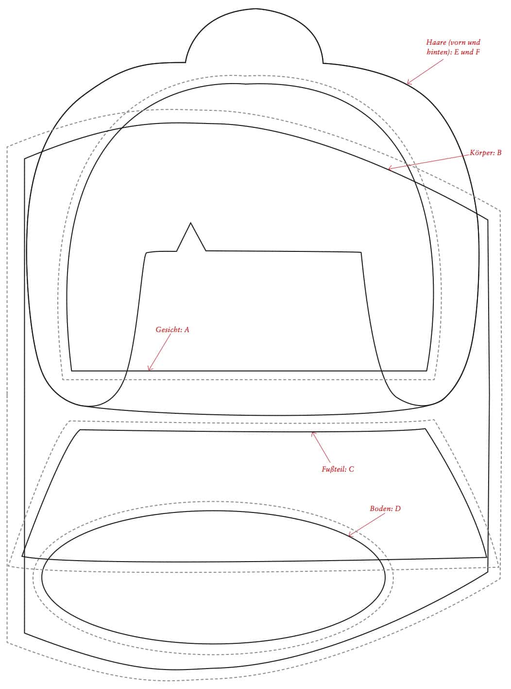 Vorne: 1 x A, 1 x B, 1 x C, 1 x E. Hinten: Schnittteile A und B an Hals aneinanderlegen und in einem Stück ausschneiden, 1 x C, 1 x F. Boden: 1xD. Die gestrichelte Linie markiert die Nahtzugabe.