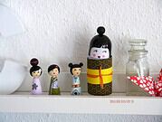 Jetzt bekommt die Kokeshi ihr eigenes Aussehen. Mit Bändern, Perlen, Pon-Pons, Knöpfen oder kleinen Stickereien wird sie unverwechselbar. Einen Namen kann man ihr auch geben: Unsere heißen Tami, Ruby und Rosa.