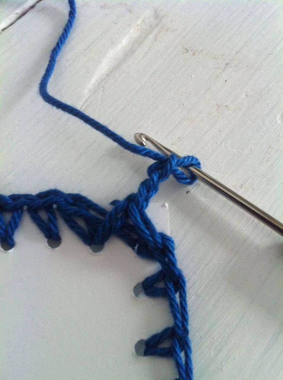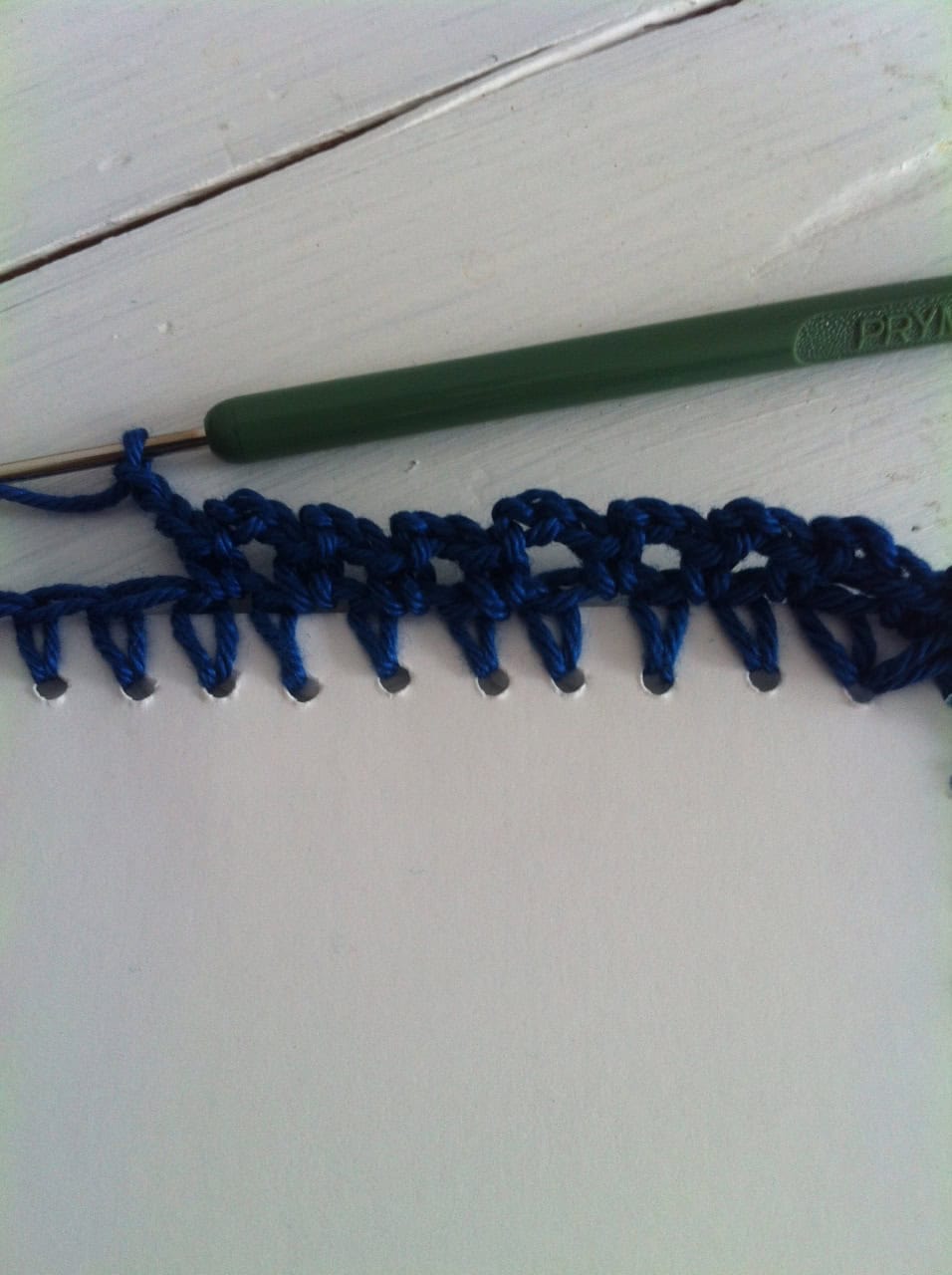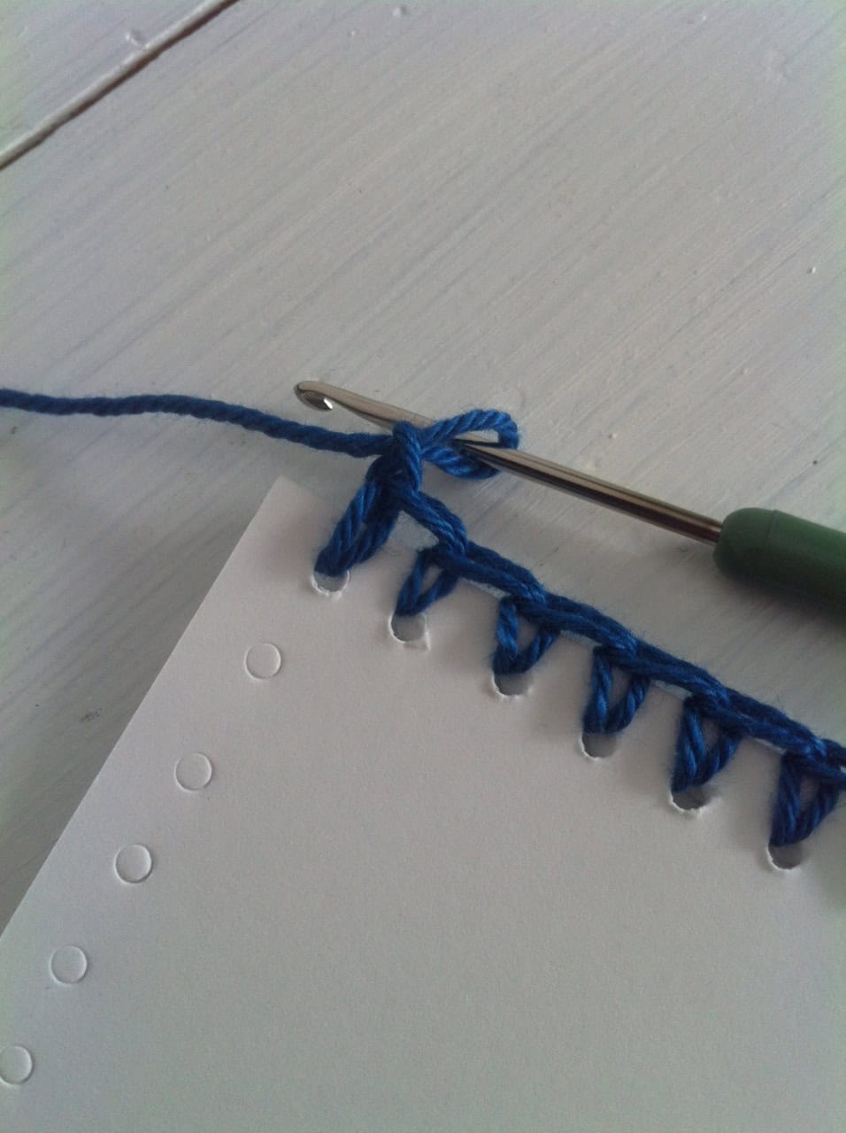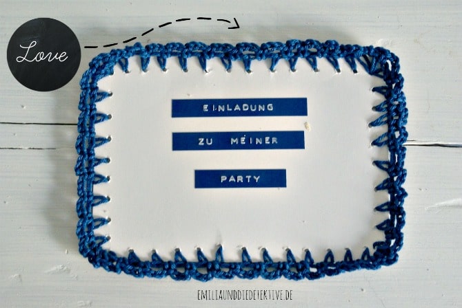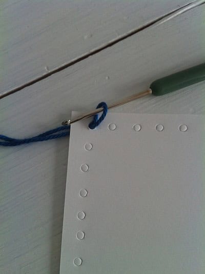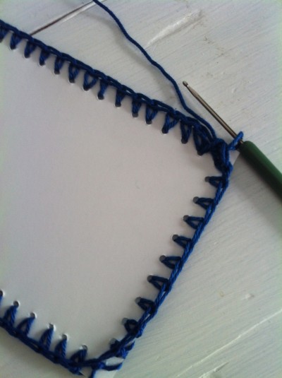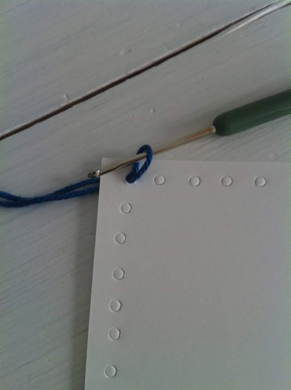 Eine Blanko Postkarte – den Rand mit Löchern versehen und mit Baumwolle rundherum verhäkelt, ergibt sie eine besondere Karte zum verschenken.