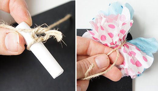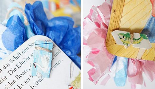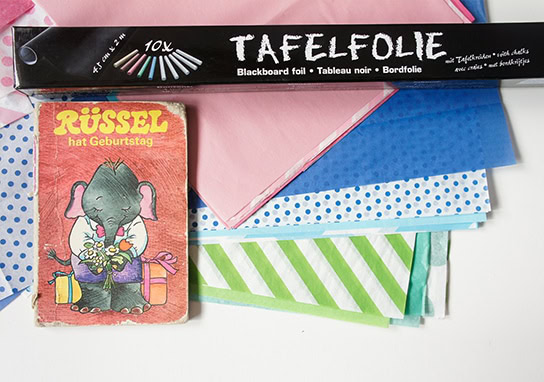 Sie sind aus einem alten Kinderbuch entstanden. Die einzelnen Seiten habe ich mit Tafelklebefolie beklebt und danach ausgeschnitten. Dekoriert ist die Tafel mit einem gefalteten Seidenpompon und einem angebunden Stück Kreide.