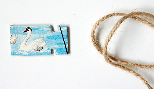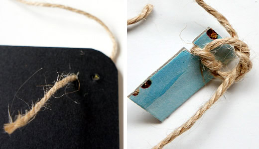 Die Schnur sollte so lang sein, dass die Kreide bequem zum Schreiben genutzt werden kann. Je nach größe der Tafel mindestens 30 cm. Stecke ein Ende in eins der Löcher. Verknote das Rechteck bei etwa 1/3 der Schnur mit einem Doppelknoten.