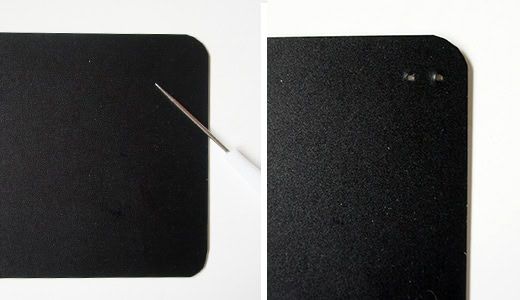 Damit die Kreide und der Pompon hängen bleiben, brauchen sie eine stabile Aufhängung. Steche mit einer Ahle, einer Nadel oder einem Nagel, zwei Löcher in eine Ecke. Sie können einen Abstand von 1 cm zueinander und zu den Rändern haben.