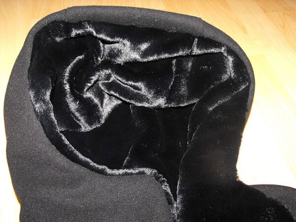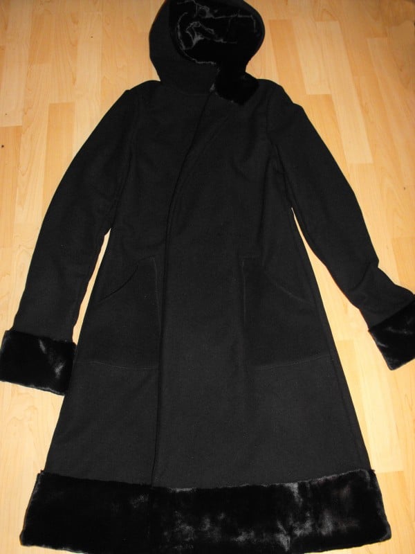 Jedenfalls habe ich einen mittelschweren Wollwebstoff, wunderbar roten Futtertaft und ganz kuschligen Webpelz benutzt. Die Kapuze habe ich etwas anders gearbeitet als vorgegeben, ich habe sie so wie die Oberstoff-Kapuze (also ohne Beleg etc.) und komplett aus dem Webpelz zugeschnitten. Soooo weich!