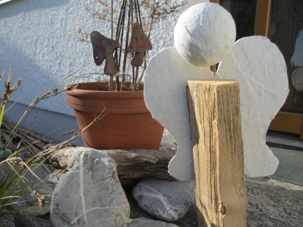 In der Zeitschrift Landlust wurde mal vor langer Zeit beschrieben, wie man zur Weihnachtszeit einen Engel aus Holz basteln kann. Mit einem Brennholzscheit. DAs Basteln ist zwar kurz eine kleine Sauerei, wegen des Anmischens von Gips, aber das Ergebnis, der Weihnachtsengel, ist wirklich schön.