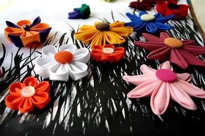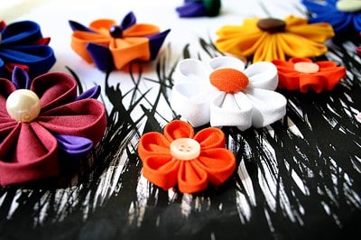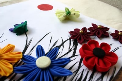Der Hintergrund der farbenfrohen Kanzashi-Blütenwiese ist eine Hommage an Japan, an alte japanische Kunst und Kalligraphie. Und die rote Sonne… nun… Symbol für Japan selbst.