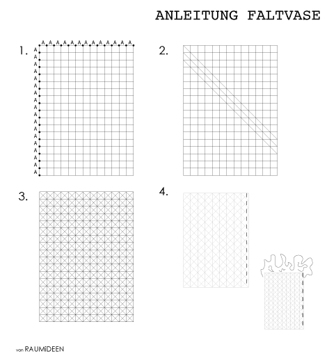 1. Einen DIN A4 Bogen Papier (120g) horizontal und vertikal in gleichmäßige Abstände teilen. An der Unterseite der Längsseite wird ein Rest bleiben, diesen abschneiden. Mit einem Falzbein (eine Nadel geht auch) entlang eines Lineals in Längs- und Querrichtung einfalzen.