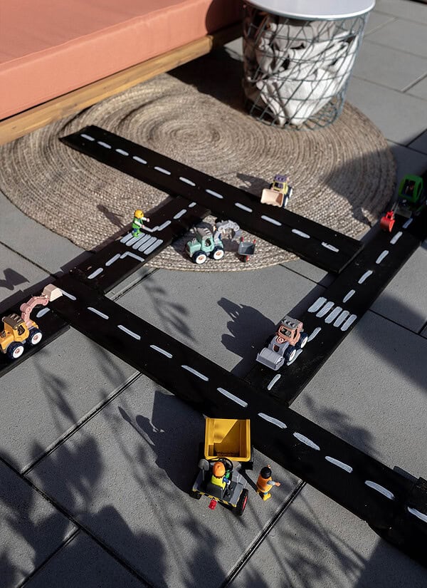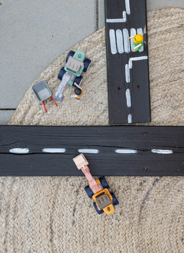 Unser Garten erwacht zum Leben, ein Summen und Tuckern erfüllt die Luft. Die Erde wird von kleinen Händen hin und her geschoben, während Stöckchen zu Zäunen werden und Steine zu aufregenden Baustellen. Hier werden der Fantasie Flügel verliehen! Doch im Mittelpunkt des bunten Treibens stehen vor allem sie – die Fahrzeuge. Bagger, Lader und Traktoren in allen Formen und Größen sind die Spielzeuge, die hier schon über Jahre für strahlende Kinderaugen sorgen. Jetzt haben sie neue mobile Fahrbahnen für den Garten bekommen. Ein so simples DIY-Projekt, das ich schon lange mal machen wollte! Die DIY-Spielstraßen die nicht nur einfach, sondern auch ruck-zuck selbst gemacht sind.