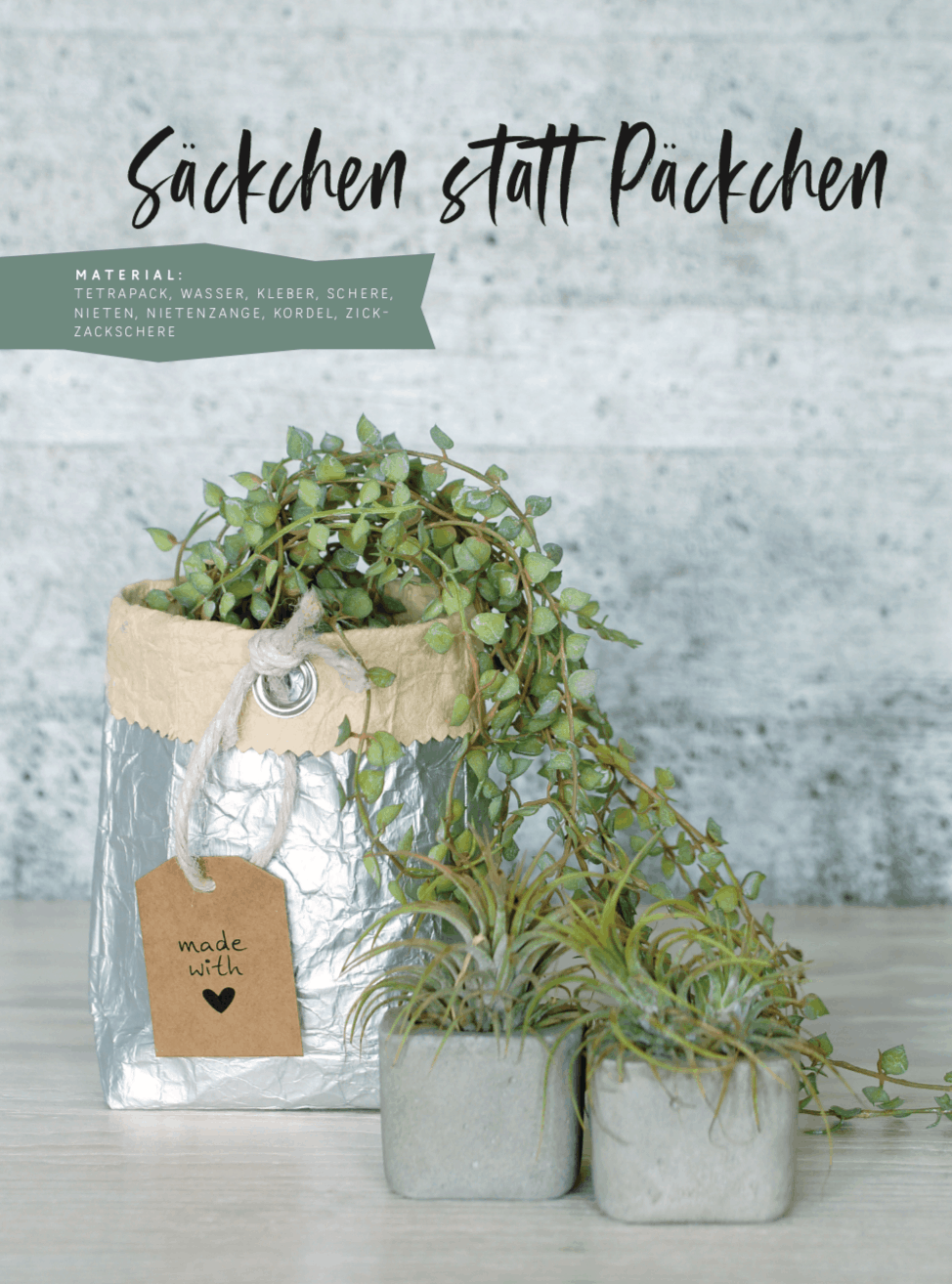 Noch eine Öse in den Umschlag und an schließend eine kleine Kordel hindurchziehen – fertig ist eine neue Verpackung oder ein kleiner Blumenübertopf.